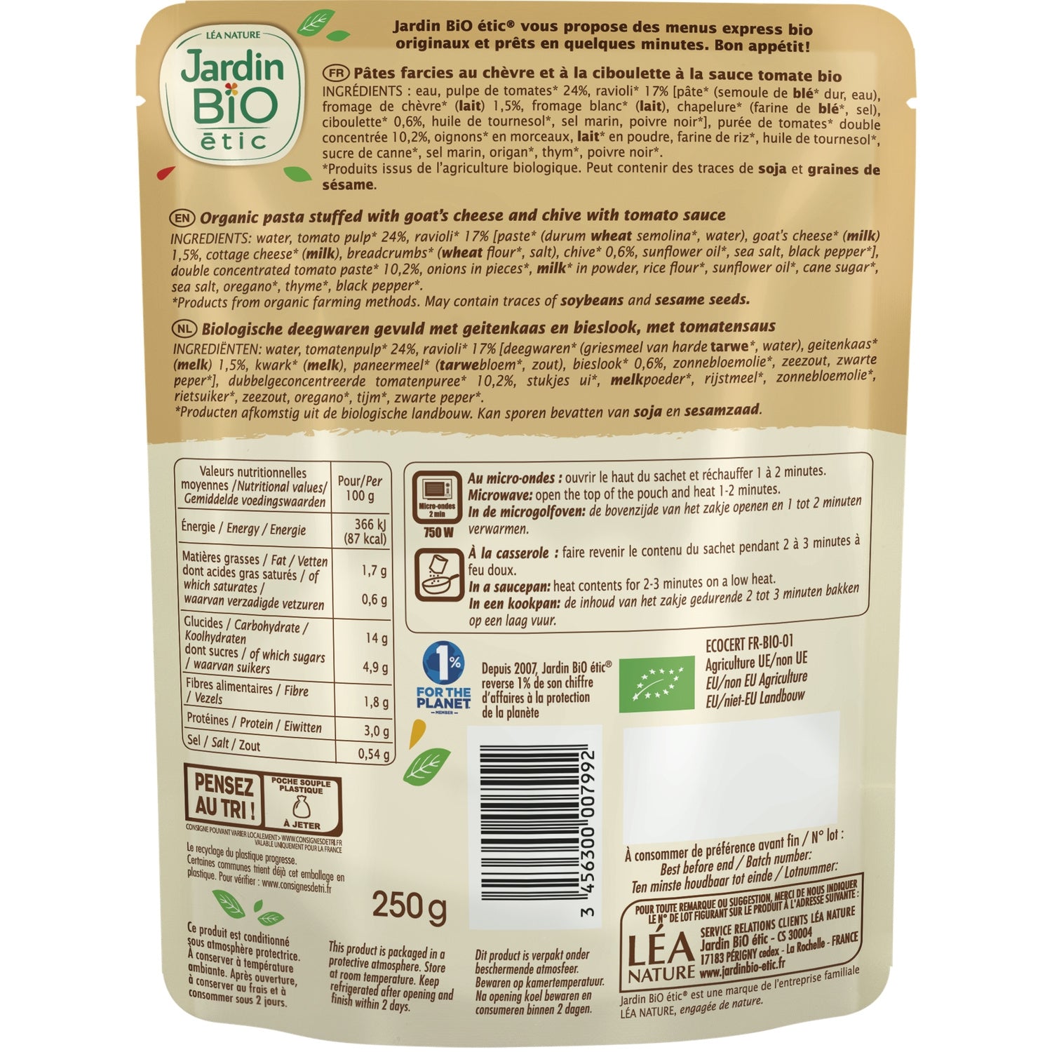 Because your time is precious, and so is your diet, Jardin BiO étic offers original organic express menus ready in minutes. Jardin BiO étic goat cheese ravioli are a delight to pan-fry or reheat in the oven with cheese, a drizzle of olive oil, and chopped basil. Enjoy!