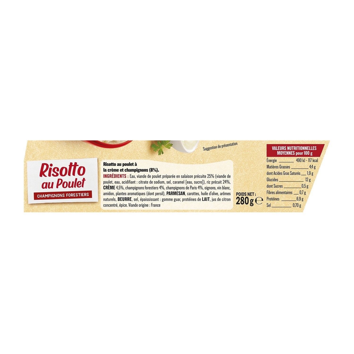 Water, precooked cured chicken meat 25% (chicken meat, water, acidifier: sodium citrate, salt, caramel water, sugar), precooked rice 24%, CREAM 4.5%, forest mushrooms 4%, button mushrooms 4%, onions white wine, starch, aromatic plants (including shallots and parsley), PARMESAN 0.75%, carrots, olive oil, natural flavorings, BUTTER, salt, thickener: guar gum, MILK proteins, concentrated lemon juice, spice.