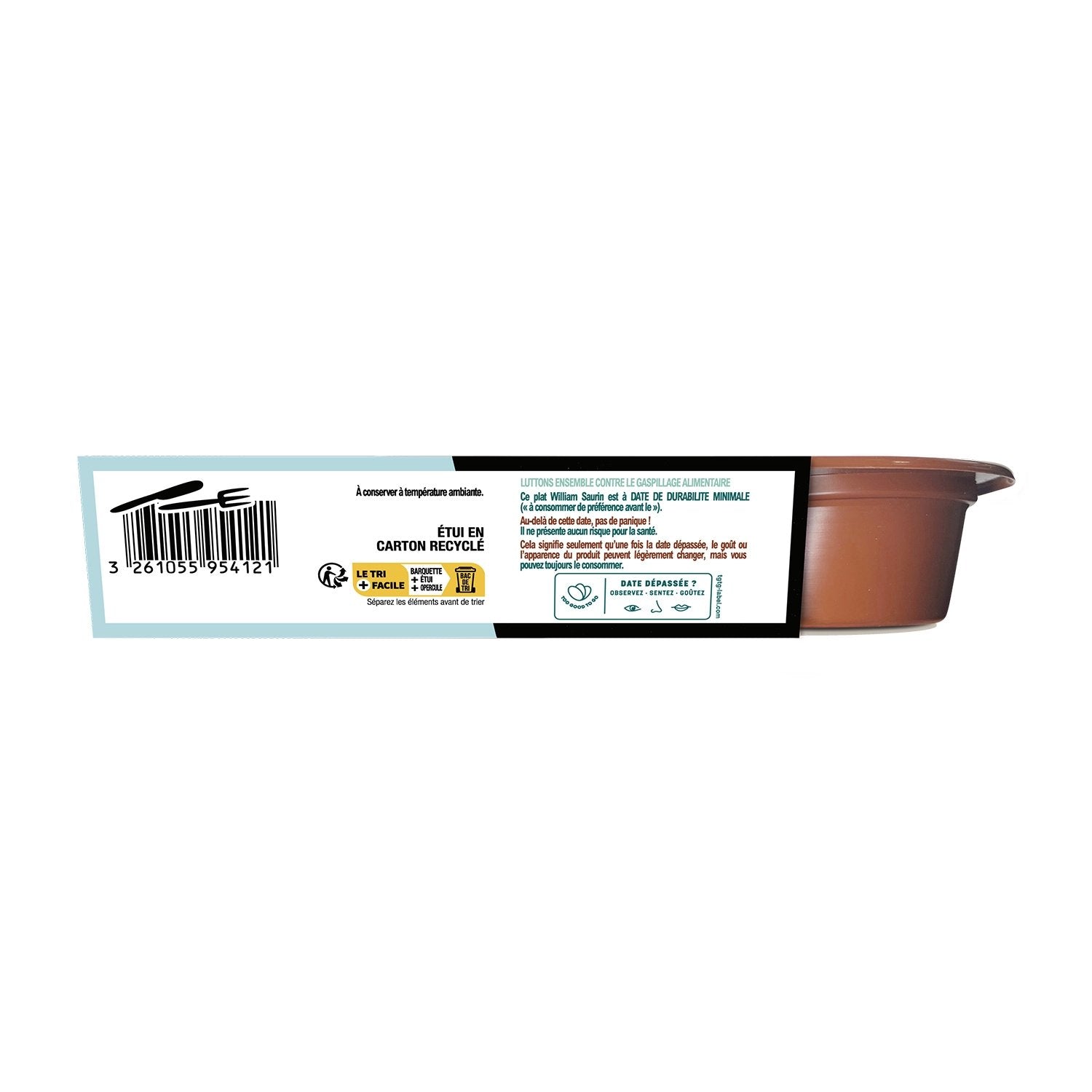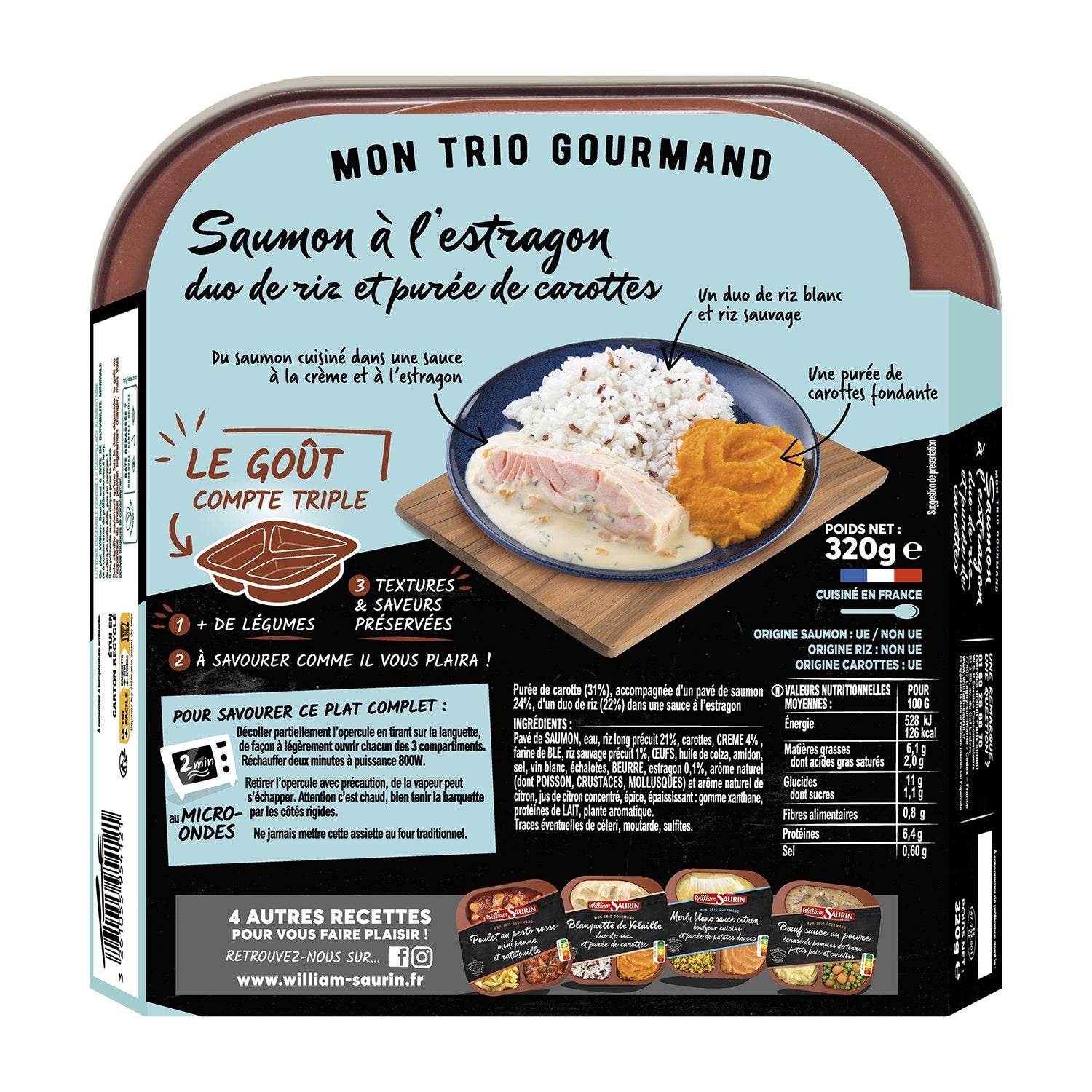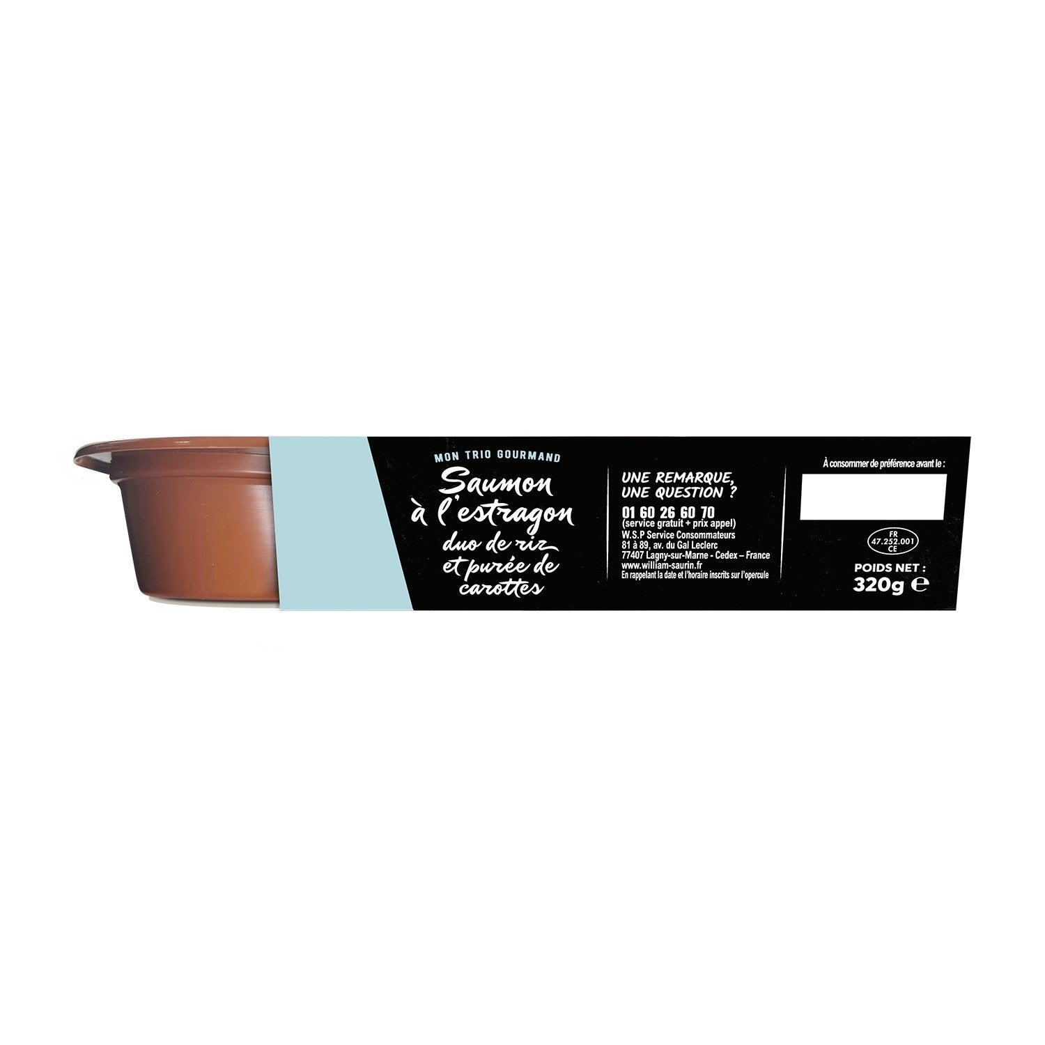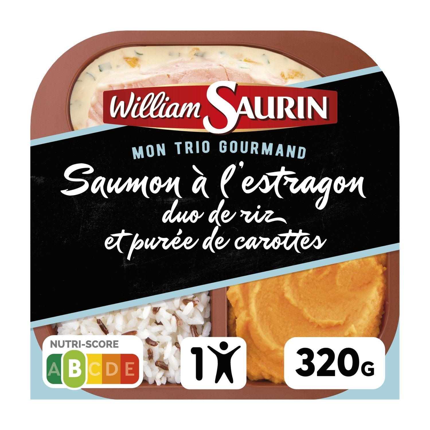 My gourmet trio Salmon with tarragon, duo of rice and carrot puree Serving suggestion Salmon cooked in a cream and tarragon sauce A duo of white rice and wild rice A melting carrot puree Taste counts triple 1) + vegetables 2) To enjoy as you like! 3) Textures & flavors preserved Cooked in France Salmon origin: EU and non-EU Rice origin: Non-EU Carrot origin: EU LET'S FIGHT FOOD WASTE TOGETHER This William Saurin dish has a MINIMUM DURABILITY DATE ("best before"). Beyond this date, don't panic! It does not pose any health risk. This only means that once the date has passed, the taste or appearance of the product may change slightly, but you can still consume it. TOO GOOD TO GO (Look – Smell – Taste logo) Tgtg-label.com 4 other recipes to please you! Find us on Facebook (logo) Instagram (logo) www.william-saurin.fr