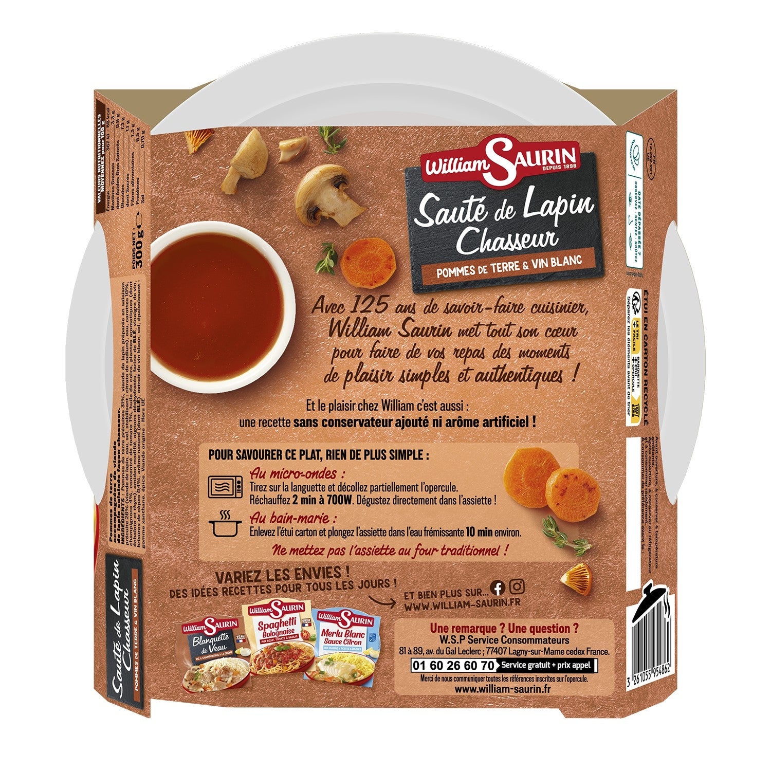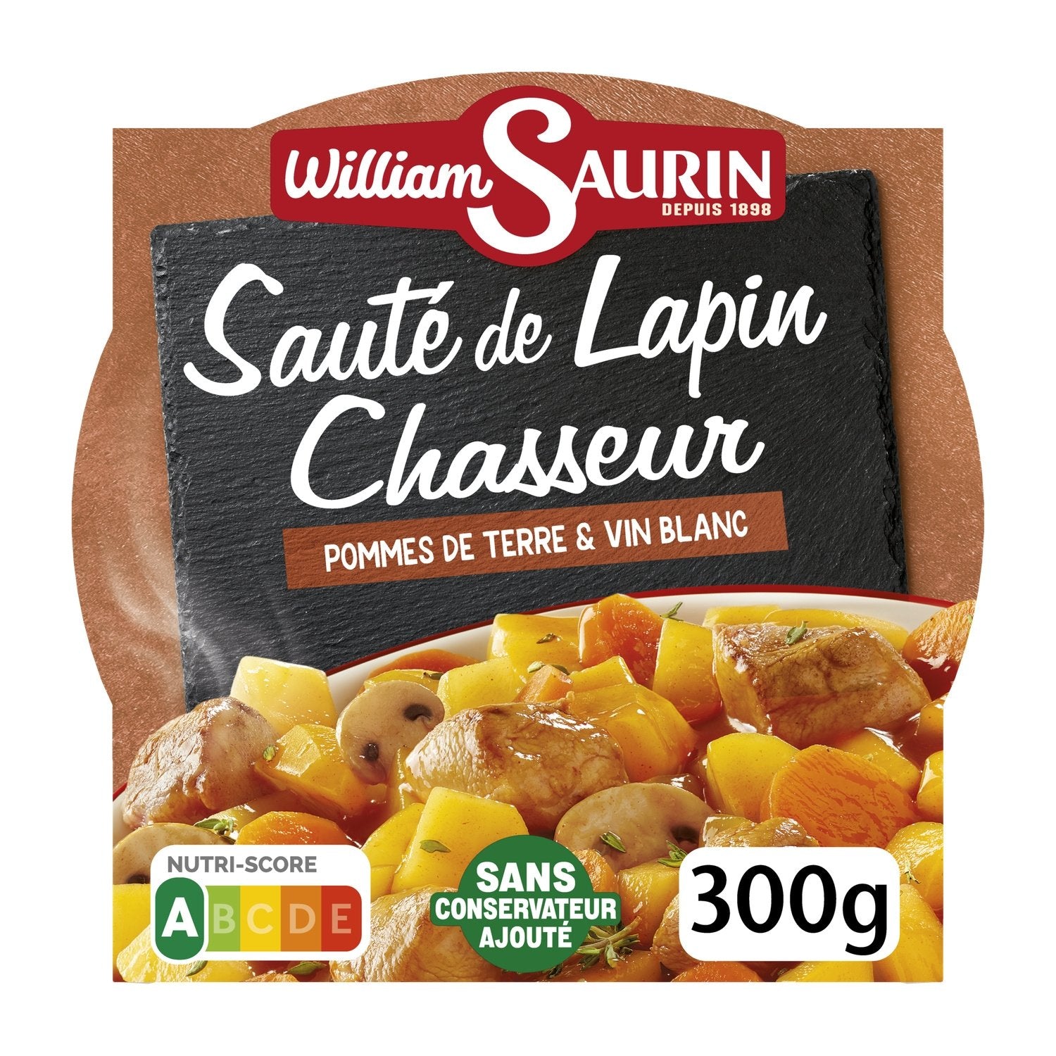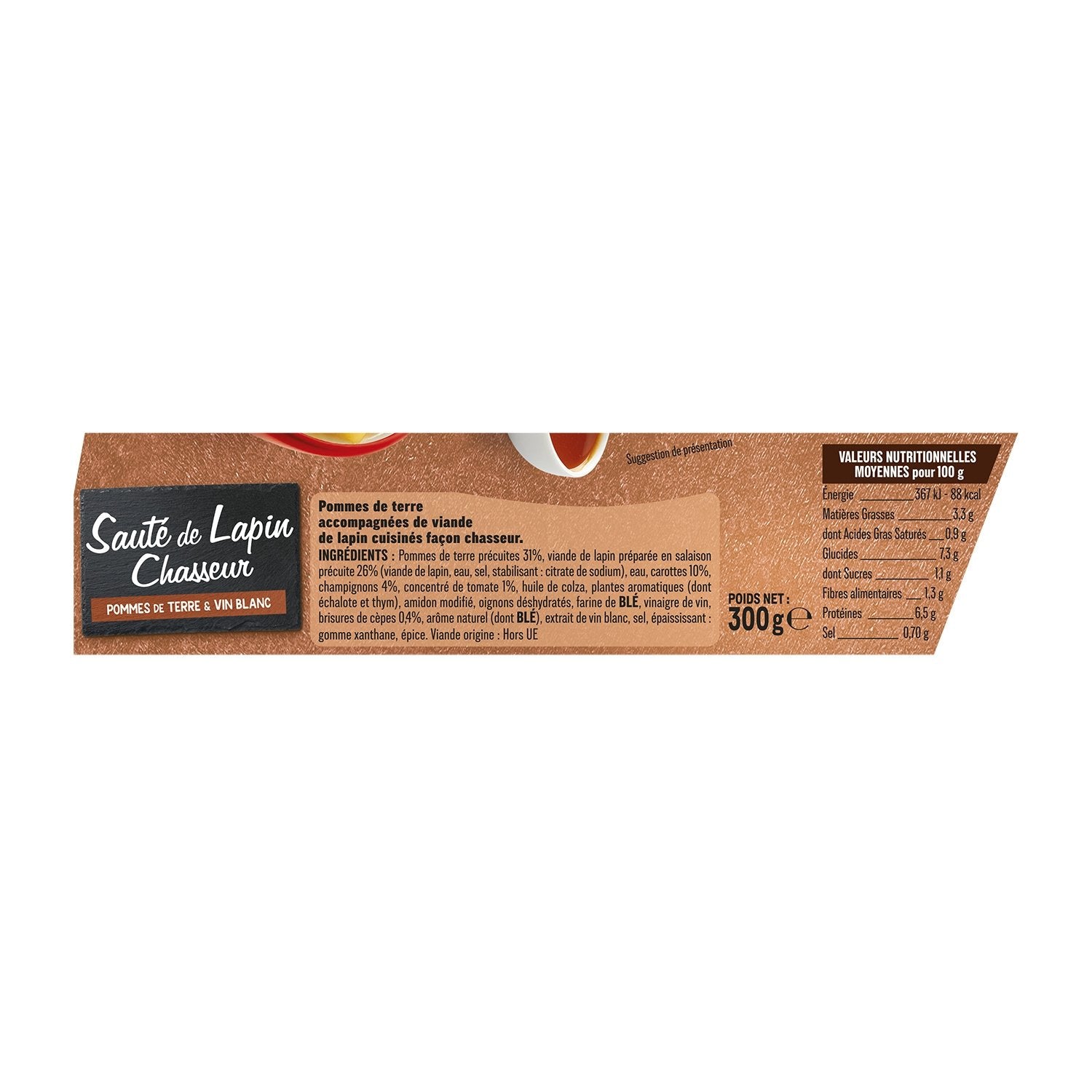 Pre-cooked potatoes 31%, pre-cooked cured rabbit meat 26% (rabbit meat, water, salt, stabilizer: sodium citrate), water, carrots 10%, mushrooms 4%, tomato paste 1%, rapeseed oil, aromatic plants (including shallot and thyme), modified starch, dehydrated onions, WHEAT flour, wine vinegar, porcini mushroom pieces 0.4%, natural flavoring (including WHEAT), white wine extract, salt, thickener: xanthan gum, spice. Meat origin: Outside the EU