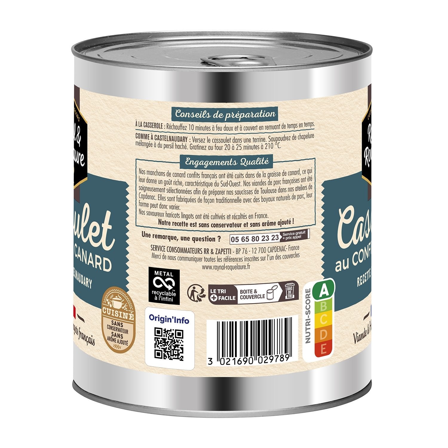 Rehydrated lingot beans 31%, water, confit duck drumsticks 16% (duck drumsticks, duck fat, salt), precooked Toulouse sausages 11% (pork, water, salt, pepper, natural casing), lard, fried onions (onions, sunflower oil and/or rapeseed oil), pork rind, salt, tomato paste, aromatic plant, spice. Duck and pork meat from France. Possible presence of bone splinters. Possible traces of: GLUTEN, EGG, CELERY, MILK, MUSTARD