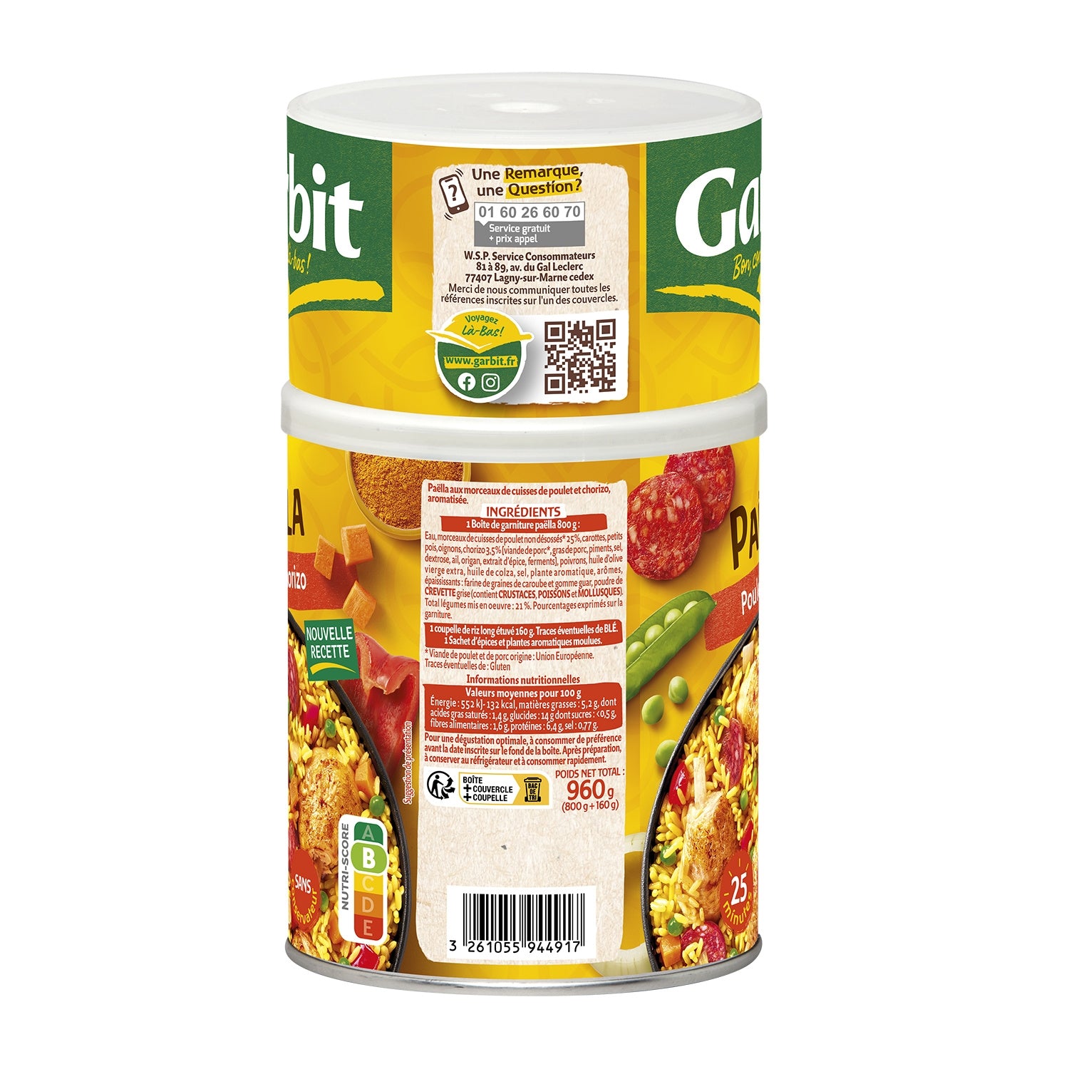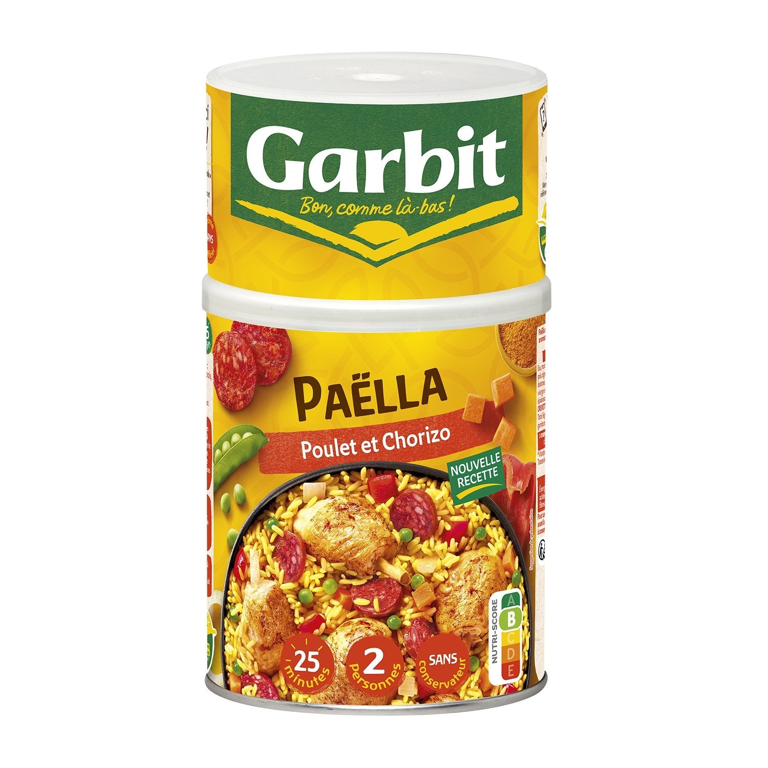 1 can of Paella filling 800g: Water, bone-in chicken thigh pieces* 25%, carrots, peas, onions, chorizo 3.5% pork*, pork fat, chili peppers, salt, dextrose, garlic, oregano, spice extract, ferments, peppers, extra virgin olive oil, rapeseed oil, salt, aromatic plant, flavorings, thickeners: carob bean flour and guar gum, gray SHRIMP powder (contains CRUSTACEANS, FISH and MOLLUSCS). Total vegetables used: 21%. Percentages expressed on the filling. 1 cup of steamed long grain rice 160g. Possible traces of WHEAT. 1 sachet of ground spices and aromatic plants. * Chicken and pork meat origin: European Union. Possible traces of: GLUTEN
