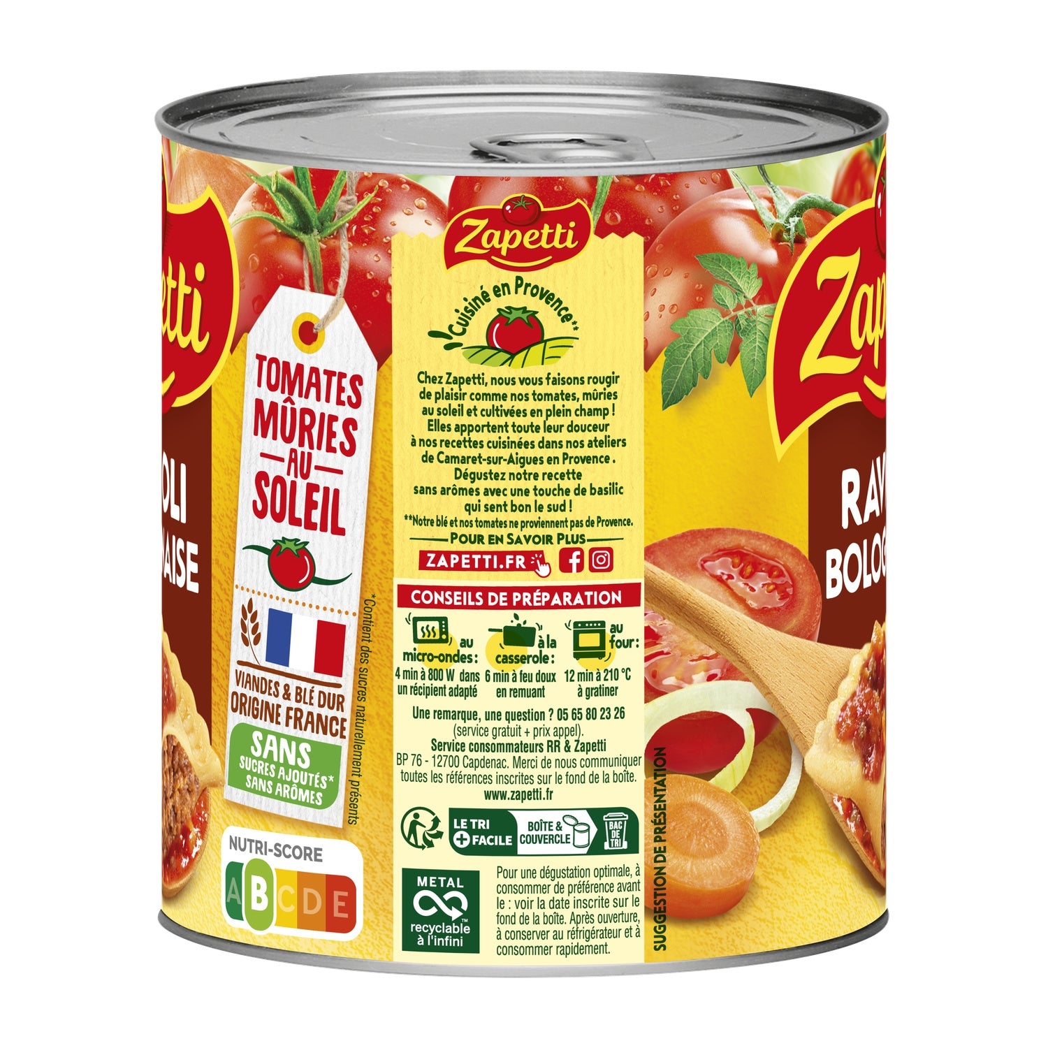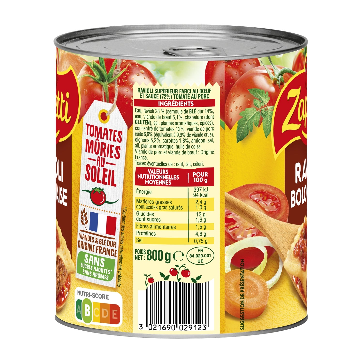 Water, ravioli 28% (durum WHEAT semolina 14%, water, beef 5.1%, breadcrumbs (including GLUTEN), salt, aromatic plants, spices), tomato paste 12%, cooked pork 6.9% (equivalent to 9.9% raw meat), onions 5.2%, carrots 1.8%, starch, salt, garlic, aromatic plant, rapeseed oil. Pork and beef: Origin France.
