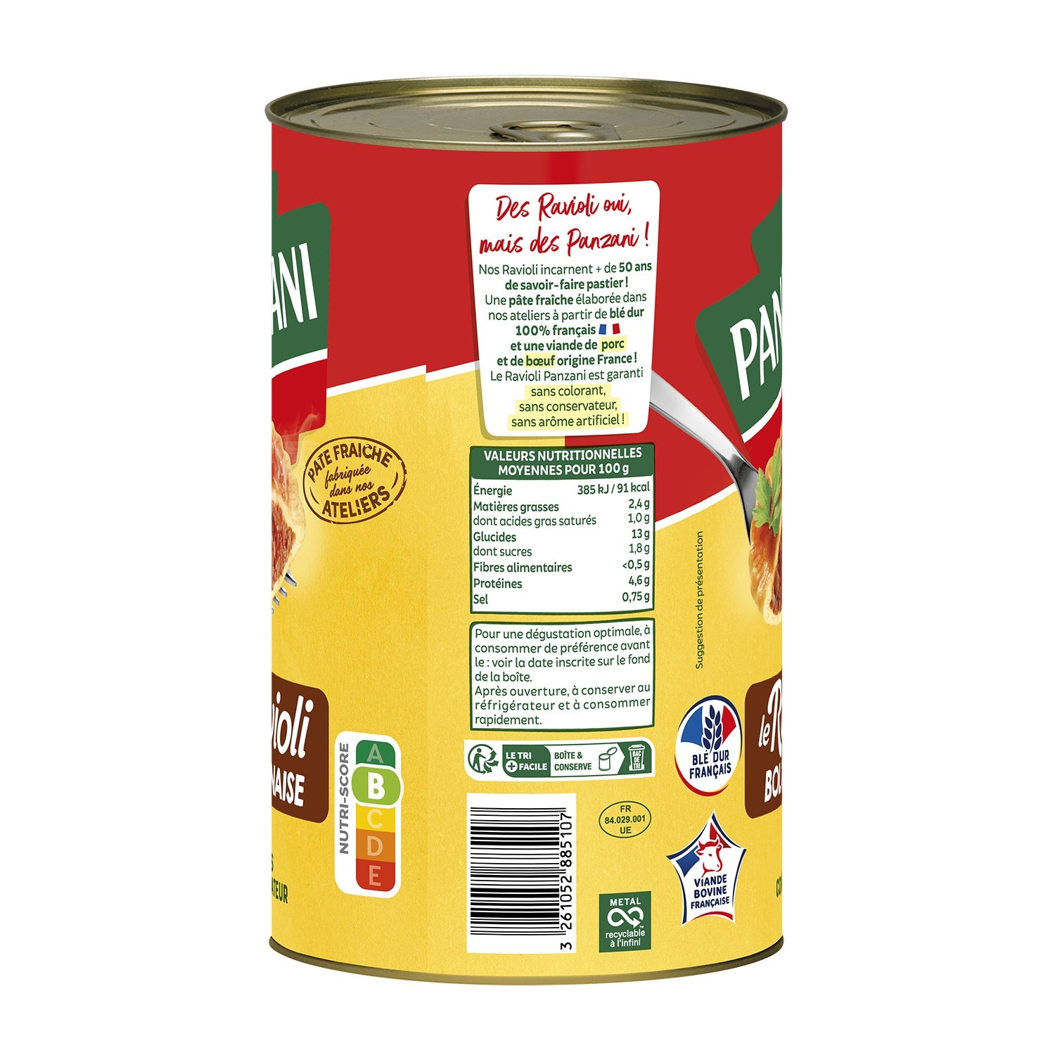 Ravioli yes, but Panzani! Our Ravioli embody more than 50 years of pasta-making expertise! A fresh pasta made in our workshops from 100% French durum wheat (+ French flag) and pork and beef from France (Highlight in yellow like the claims 'FREE' "pork" and "beef")! Panzani Ravioli is guaranteed to be free of coloring, preservatives and artificial flavors!