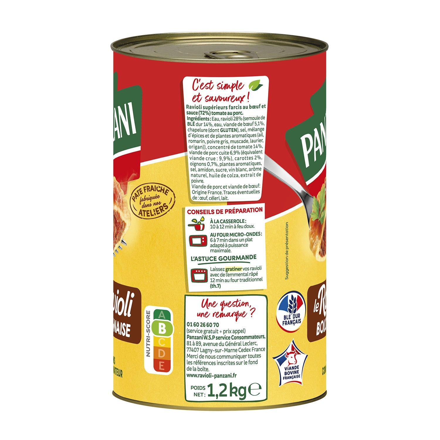 Water, ravioli 28% (durum WHEAT semolina 14%, water, beef 5.1%, breadcrumbs (including GLUTEN), salt, mixture of spices and aromatic plants (garlic, rosemary, gray pepper, nutmeg, bay leaf, oregano)), tomato paste 14%, cooked pork 6.9% (raw meat equivalent: 9.9%), carrots 2%, onions 0.7%, aromatic plants, salt, starch, sugar, white wine, natural flavoring, rapeseed oil, pepper extract. Pork and beef: Origin France.