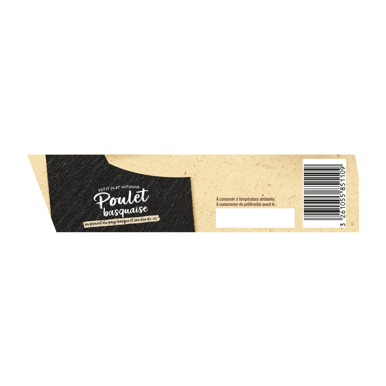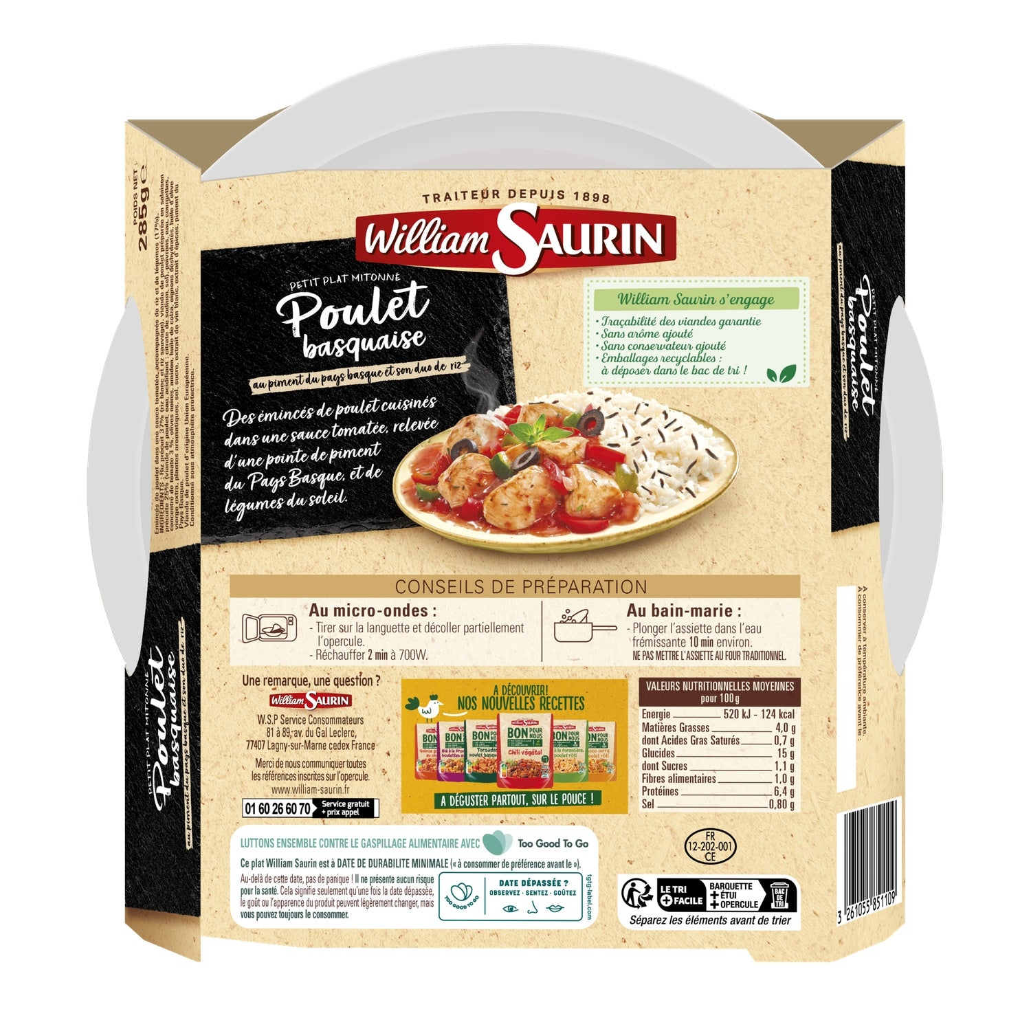 Sliced chicken cooked in a tomato sauce, spiced with a hint of Basque pepper, and sunny vegetables. EXPIRED END? Before throwing away: look - smell - taste / Too Good To Go Tgtg-label.com LET'S FIGHT FOOD WASTE TOGETHER WITH Too Good To Go This William Saurin dish has its MINIMUM DURABILITY DATE ("best before"). Beyond this date, don't panic! It presents no health risk. This only means that once the date has passed, the taste or appearance of the product may change slightly, but you can still eat it. + insert with new Doypack range Good for Us WILLIAM SAURIN is committed Guaranteed meat traceability No added flavoring No added preservatives Recyclable packaging: place in the recycling bin!