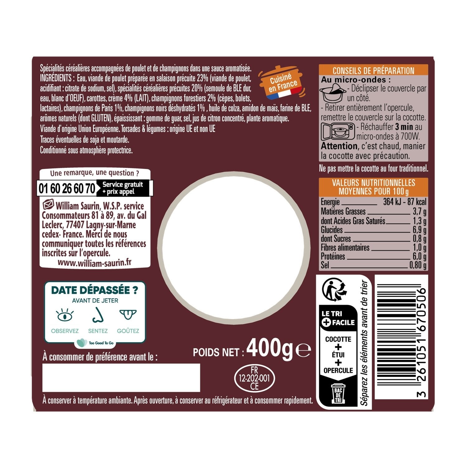 Ingredients: Water, precooked cured chicken meat 23% (chicken meat, acidifier: sodium citrate, salt), precooked cereal specialties 20% (durum WHEAT semolina, water, EGG white), carrots, CREAM 4%, forest mushrooms 2% (ceps, boletus, milkcaps), button mushrooms 1%, dehydrated black mushrooms 1%, rapeseed oil, corn starch, WHEAT flour, natural flavorings (including GLUTEN), thickener: guar gum, salt, concentrated lemon juice, aromatic plant. Meat of European Union origin. Twists & vegetables: EU and non-EU origin. Possible traces of SOYA and MUSTARD