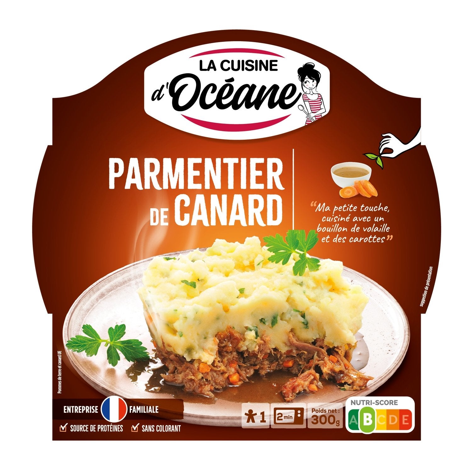 I've selected shredded duck for you, sautéed in duck fat with pearl onions and carrots. For a delicious dish, mashed potatoes with crème fraîche complete my Parmentier. A regional dish that will delight your taste buds! A balanced recipe, a source of protein, guaranteed to be free of artificial colors and flavors.