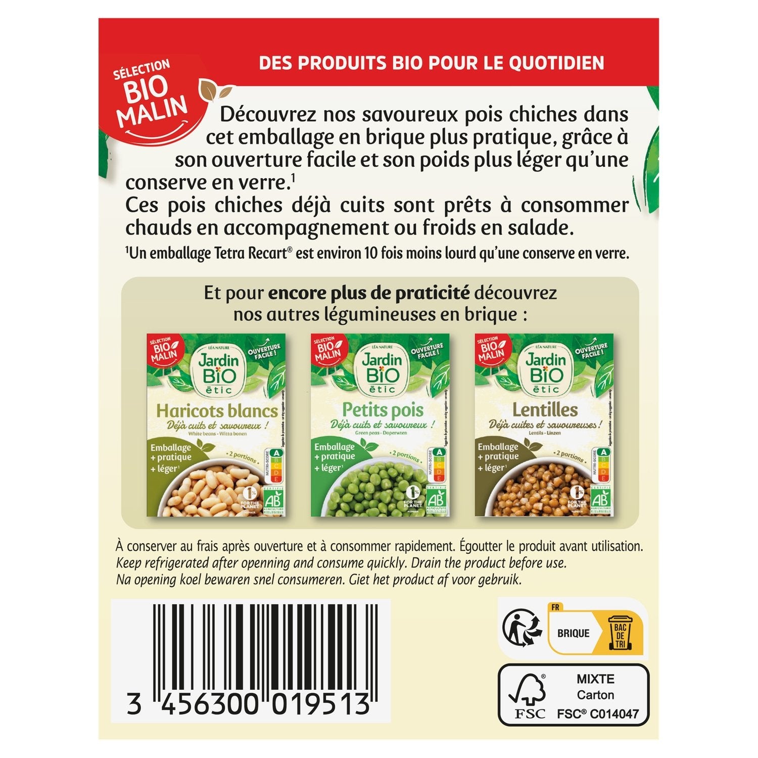 Discover our tasty chickpeas in this more practical brick packaging, thanks to its easy opening and lighter weight than a glass can*. These already cooked chickpeas are ready to eat hot as a side dish or cold in a salad. *A Tetra Recart® package is approximately 10 times lighter than a glass can. 2 servings 1% for The Planet 100% Organic Easy opening More practical, lighter packaging Nutriscore A