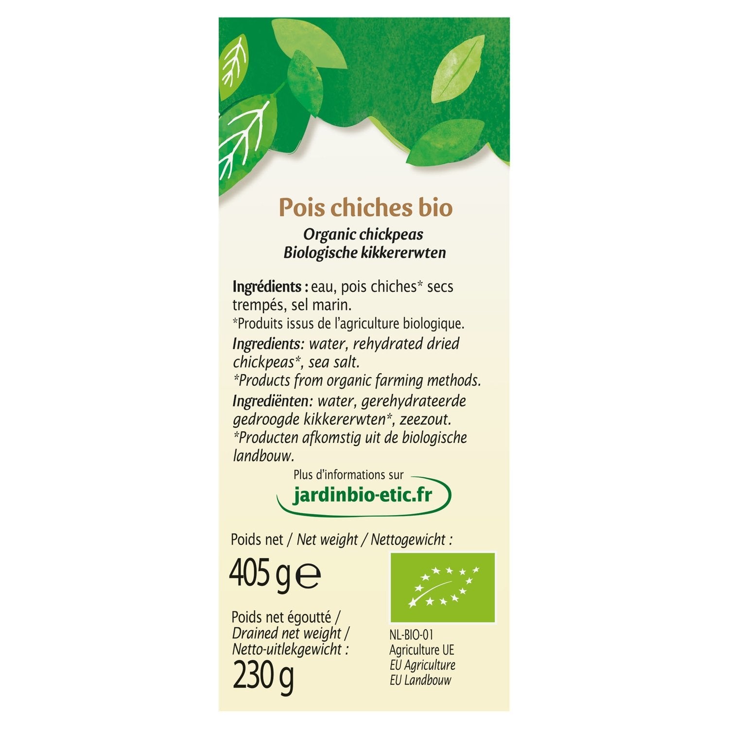 Ingredients: Water, soaked dried chickpeas*, sea salt. *Products from organic farming.