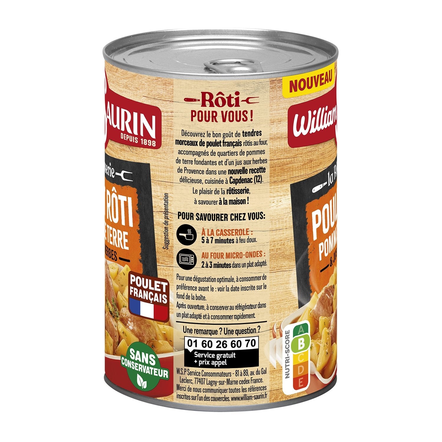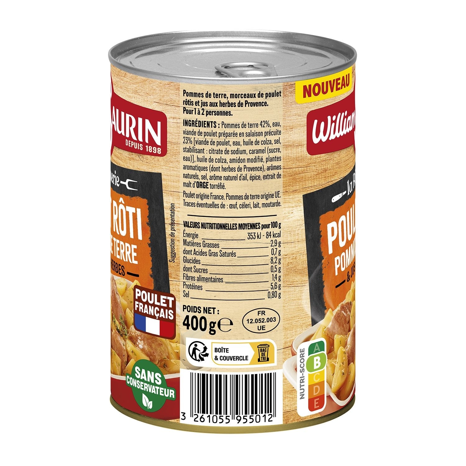 INGREDIENTS: Potatoes 42%, water, precooked cured chicken meat 23% chicken meat, water, rapeseed oil, salt, stabilizer: sodium citrate, caramel (sugar, water), rapeseed oil, modified starch, aromatic plants (including herbes de Provence), natural flavorings, salt, natural garlic flavoring, spice, roasted BARLEY malt extract. Chicken from France. Potatoes from EU. Possible traces of: EGG, CELERY, MILK, MUSTARD.