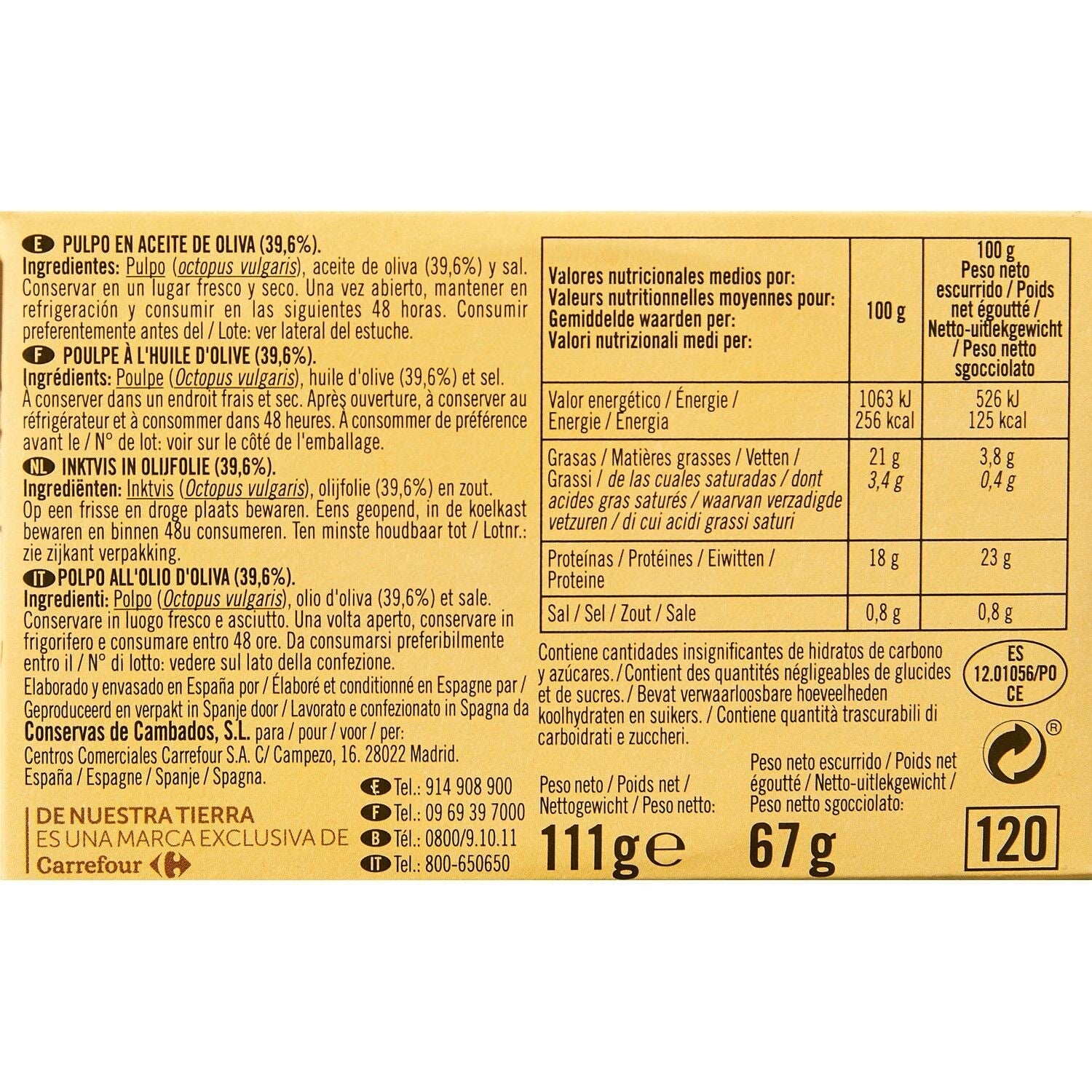 OCTOPUS (Octopus vulgaris), olive oil (39.6%) and salt.