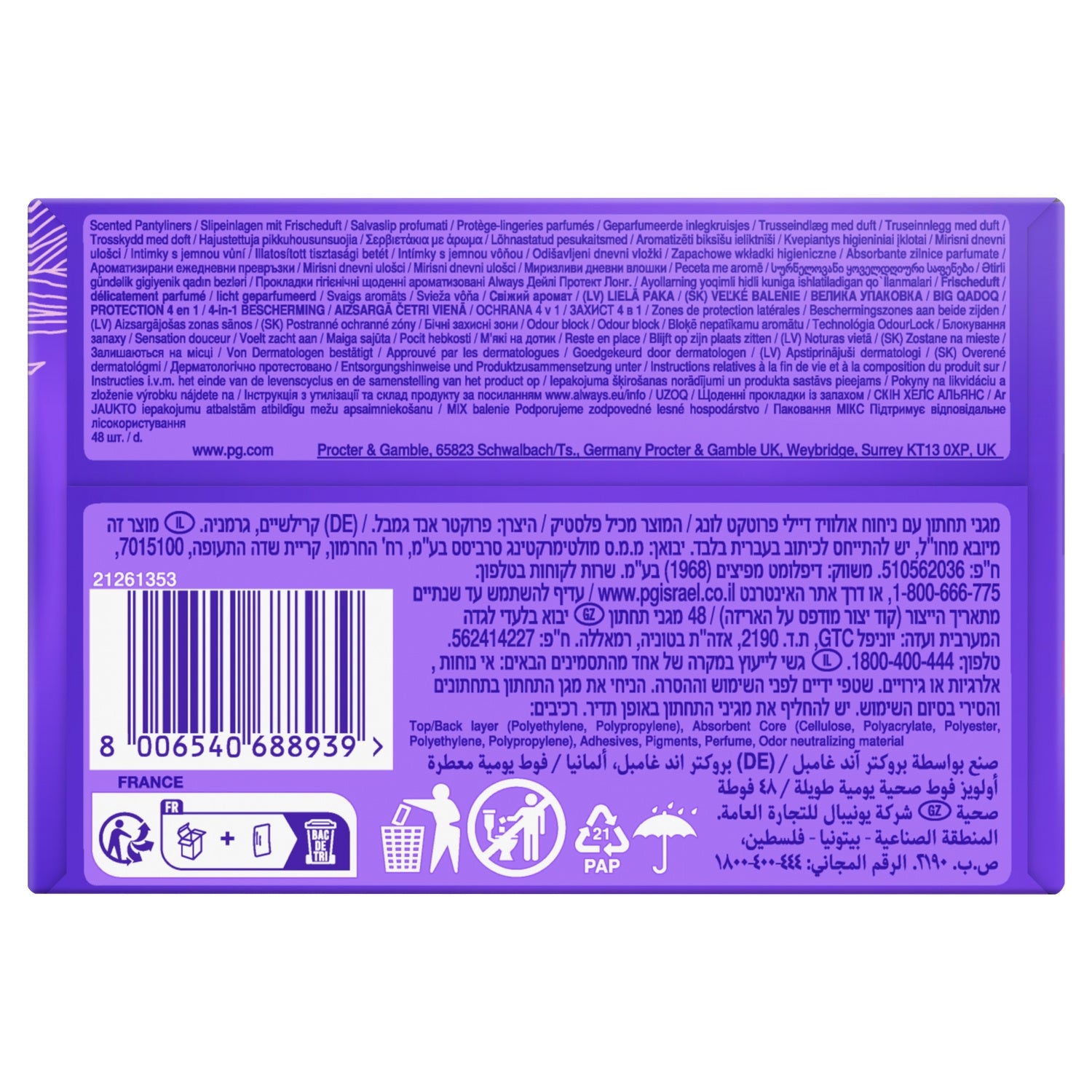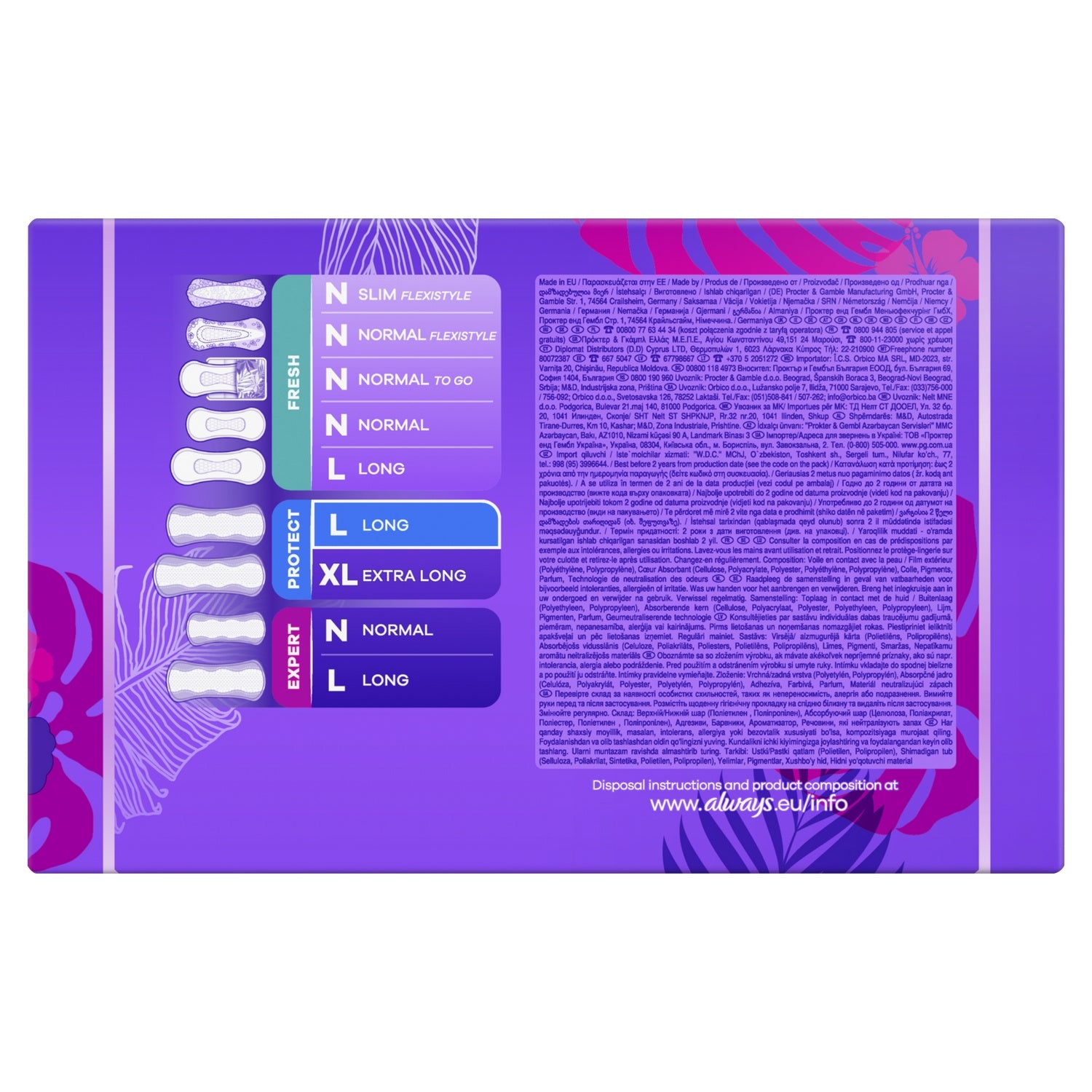 Panty liners with a fresh scent, Panty liners with absorbent side protection zones for extra protection against leaks, Stays in place in all circumstances, Long liners for extra protection compared to Always Daily Fresh Normal, Approved by dermatologists of the Skin Health Alliance