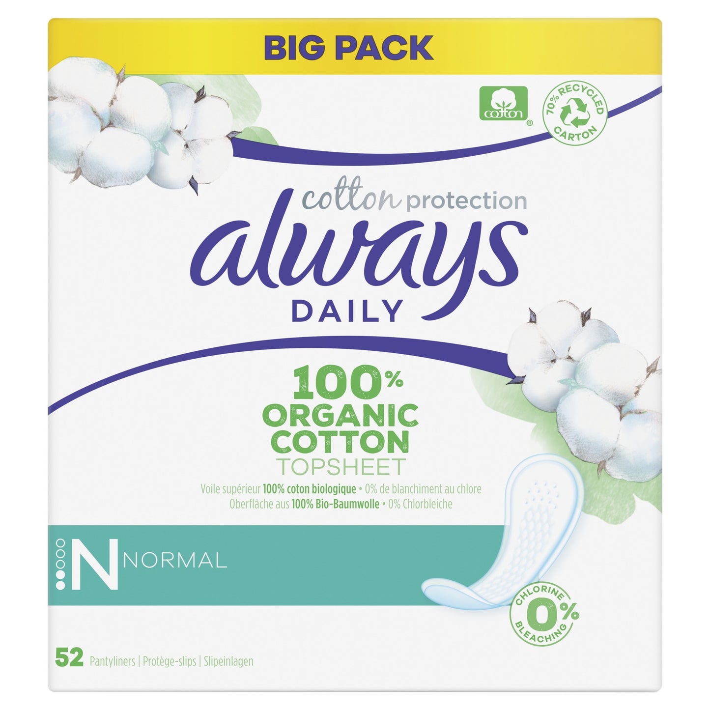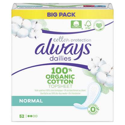 Always Daily Cotton Protection Panty Liners Regular 52 Panty Liners, 100% Organic Cotton Top Sheet