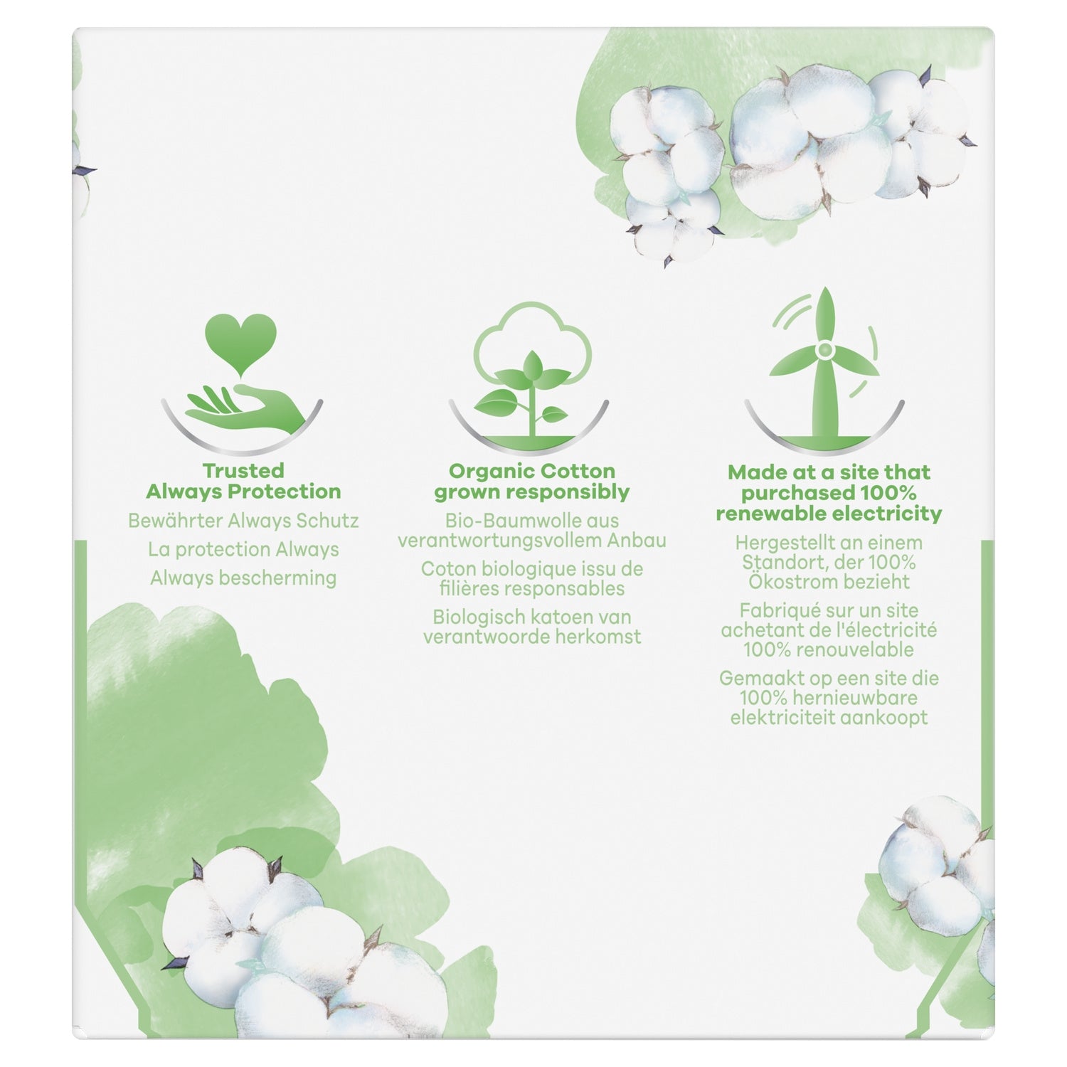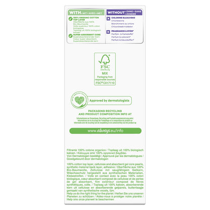 Always Daily protection with a 100% GOTS certified organic cotton layer, Fragrance and dye free panty liners, Always Daily panty liners are specially designed for daily use. The core absorbs and retains discharge, Comfortable design, Micro-ventilated design, Approved by dermatologists of the Skin Health Alliance, Certified by Cotton Inc, To learn more about our products, please visit our website