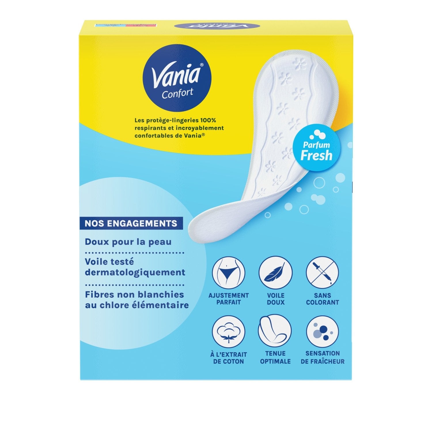 The VANIA® panty liner is ideal for everyday wear and gives you a long-lasting feeling of freshness thanks to: - A lower and intermediate layer made of polymers, 100% breathable! - An absorbent core made of plant-based cellulose fibers and ultra-absorbent microbeads - A soft veil with cotton extract, dermatologically tested - Optimal hold - A perfect fit - Lightly scented