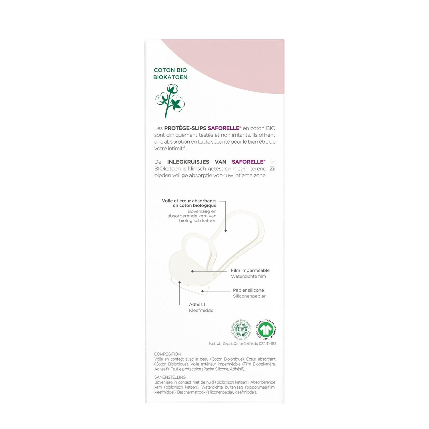 Veil and absorbent core in organic cotton certified GOTS by ICEA Adhesive protector: Silicone paper Adhesive: Synthetic Waterproof film
