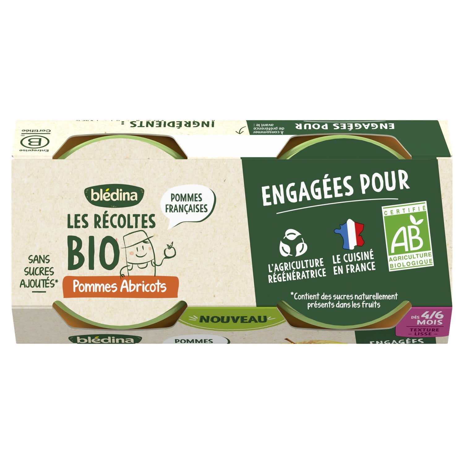 Blédina's Organic Harvests offer more than 35 recipes tailored to baby's needs*. Our baby food jars are committed to sustainable agriculture with our partner farmers, and are prepared in Brive-la-Gaillarde, France. Blédina Organic Harvests - Apples and Apricots from 4/6 months. Delicious organic baby food jars to gently introduce your baby to their first fruits, with a smooth texture that's ideal for those first spoonfuls. *According to infant nutrition regulations