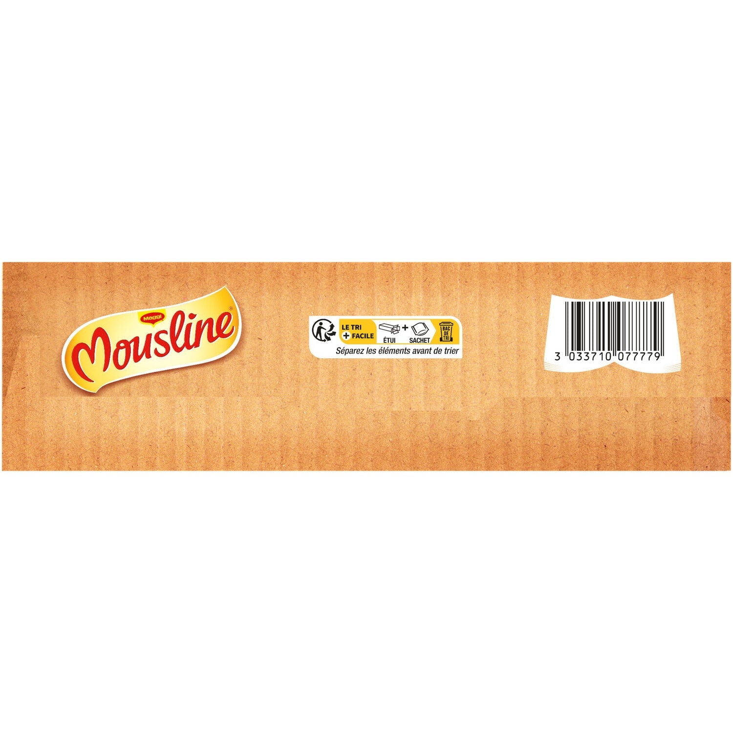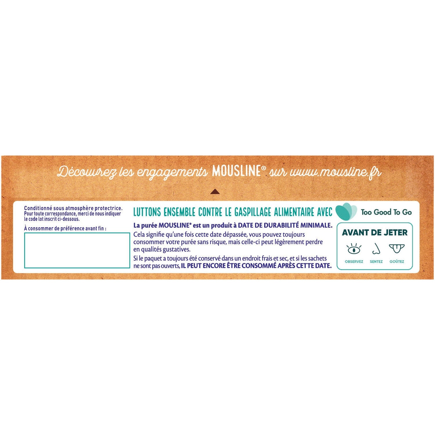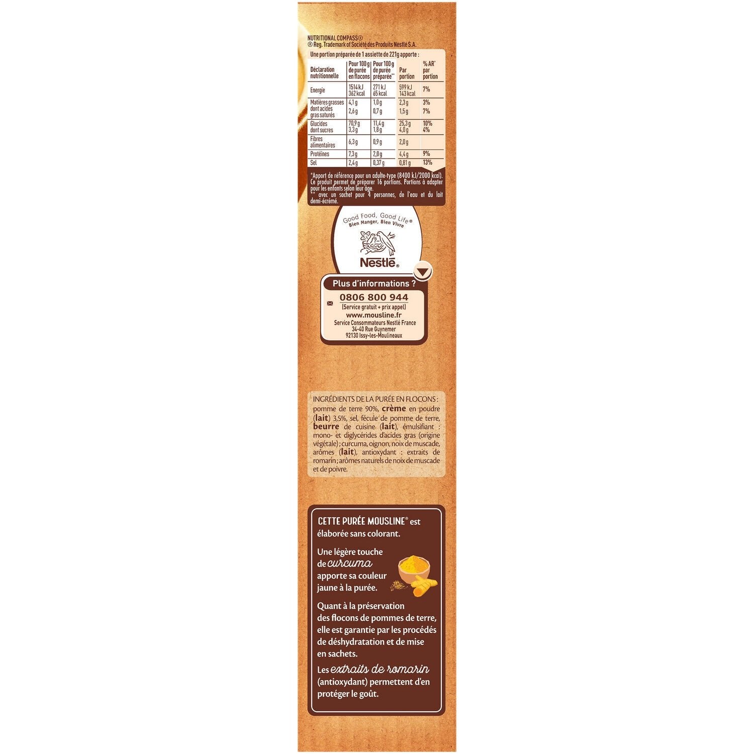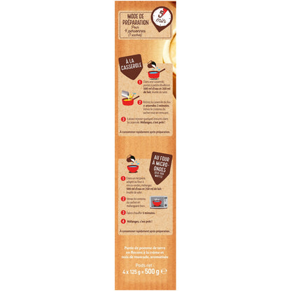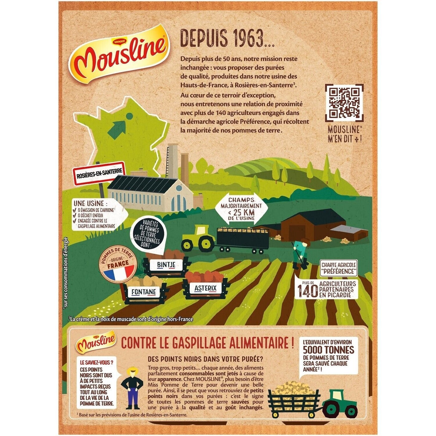 Our MOUSLINE Cream and Nutmeg purée is made from 90% potato. French potatoes, mostly harvested in Picardy, are delivered to the MOUSLINE production facility. They are carefully washed, peeled, and steamed. They are then mashed into a purée, from which the water is extracted to reduce it to flakes. Cream and nutmeg are then added, resulting in a creamy purée with a unique flavor. Produced in Picardy. Recyclable cardboard. One box contains 4 sachets for 4 people.