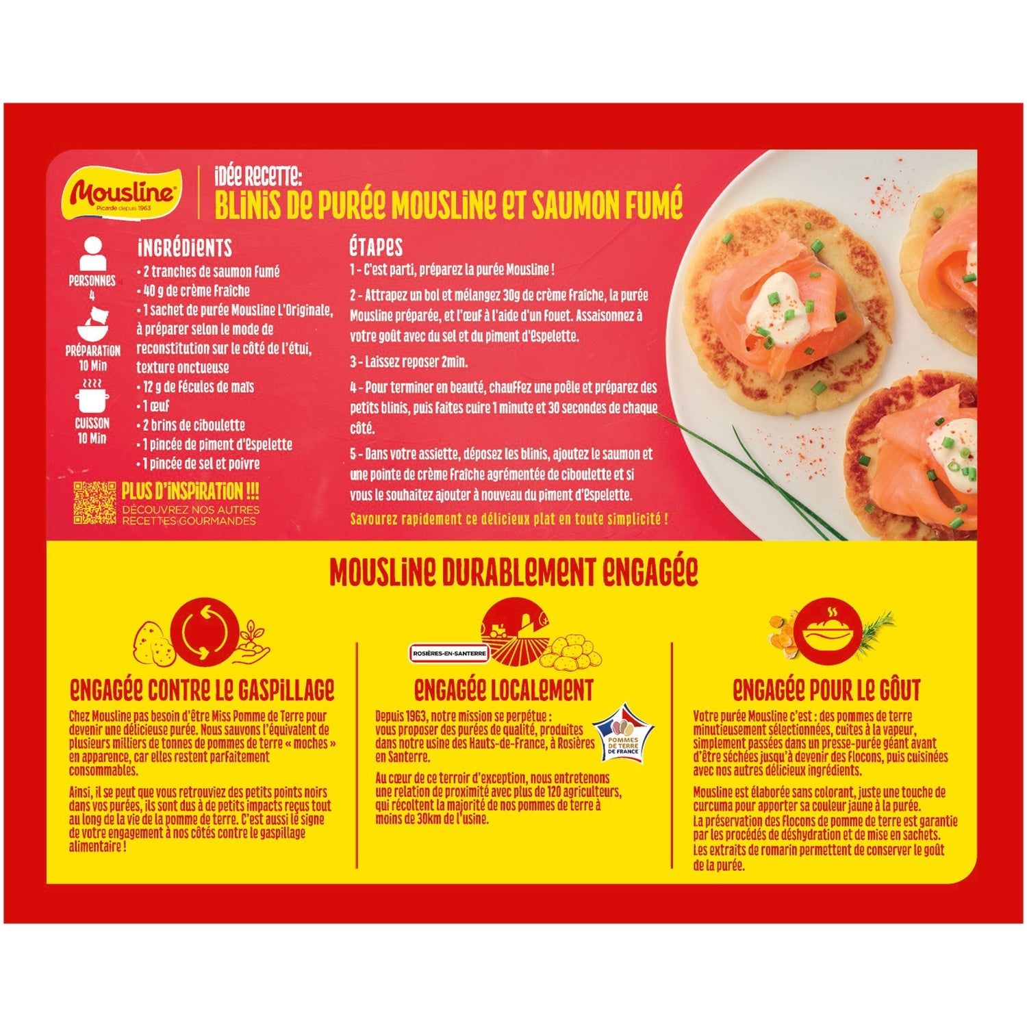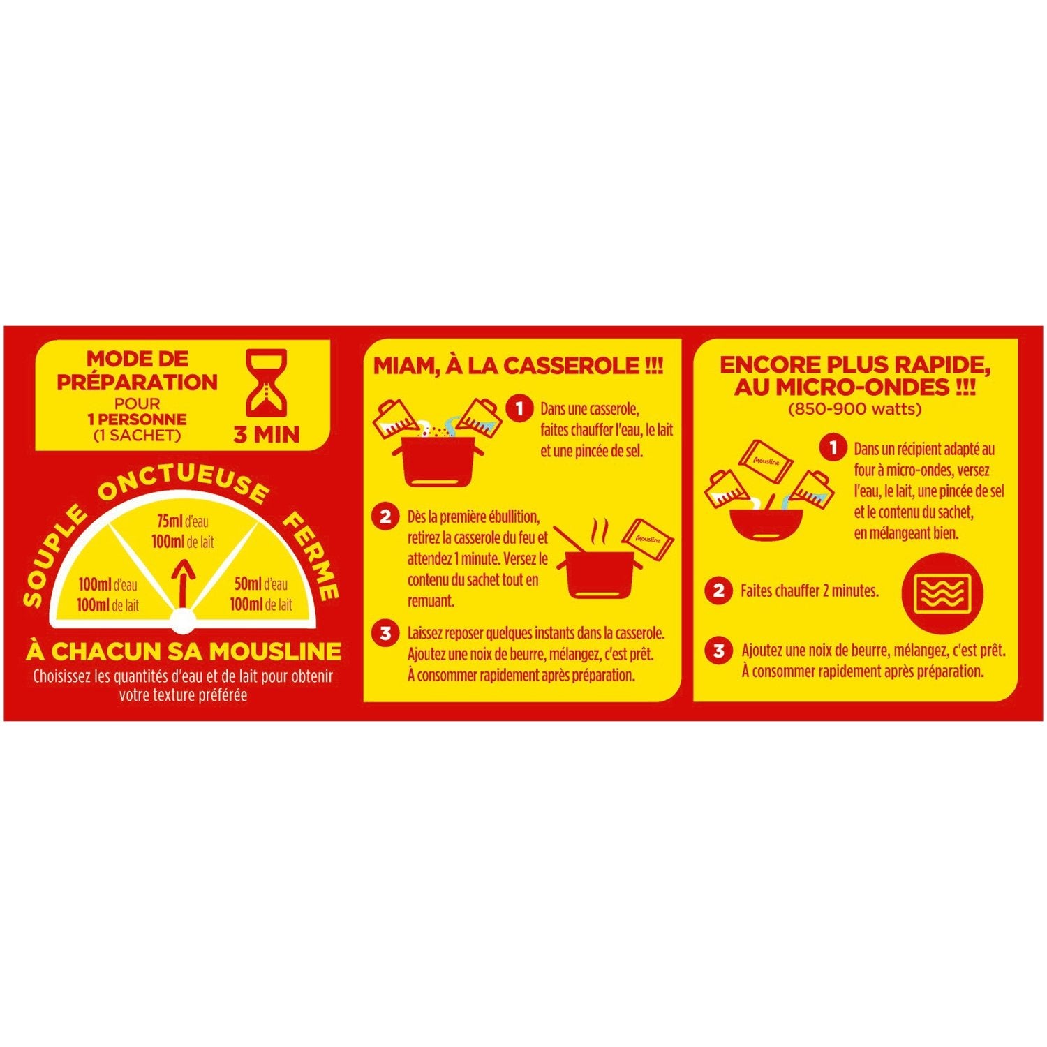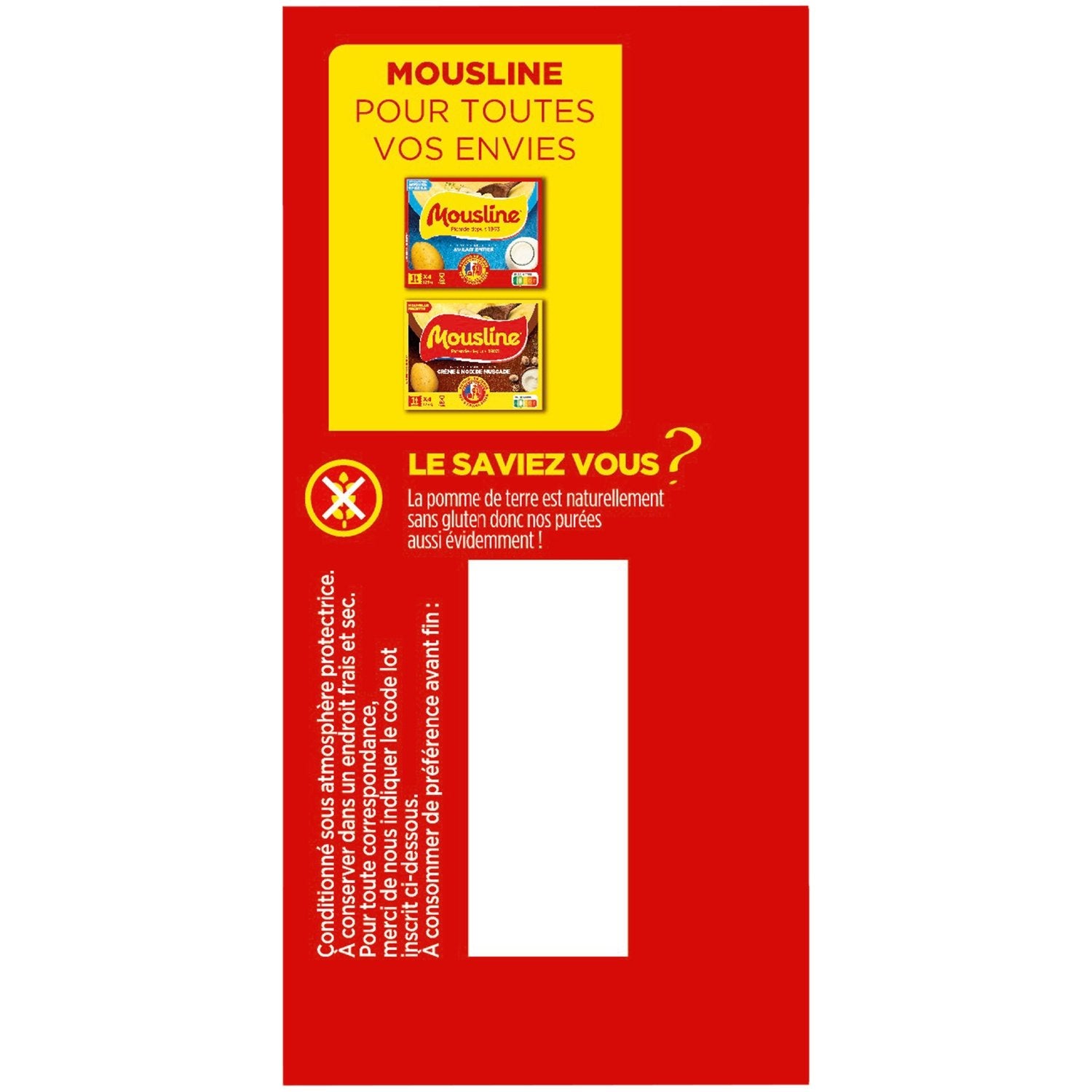 A delicious mash made from 99% potatoes, produced in our factory in Hauts-de-France.,No coloring, no flavoring and naturally gluten-free.,Quick and easy to prepare: ready in 3 minutes, in a saucepan or microwave.,To each his own MOUSLINE: choose the quantities of water and milk indicated for a soft, creamy or firm mash.,Recipe idea and gourmet tip on the back of the pack.