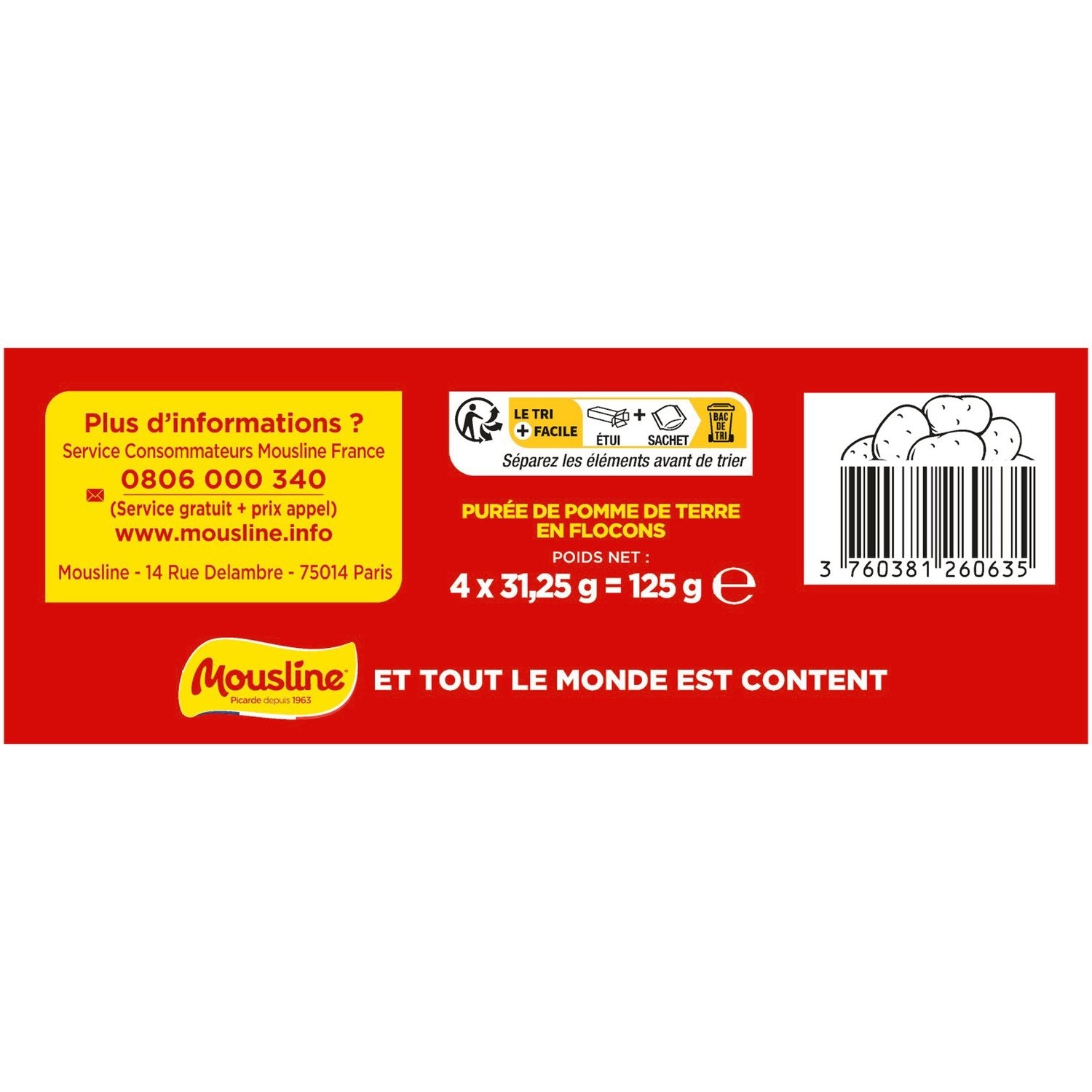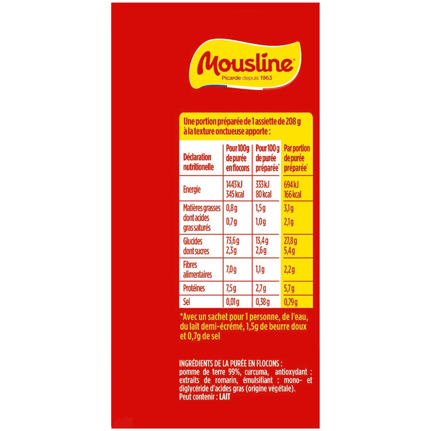 Discover our delicious MOUSLINE L'ORIGINALE mashed potatoes, made from 99% potatoes, a touch of turmeric for color, rosemary extracts for preservation, and a plant-based emulsifier for dehydration. Our L'ORIGINALE mashed potatoes are free from coloring and flavoring. Our potatoes are 100% French and mostly harvested within 30 km of our factory in Hauts-de-France. MOUSLINE is committed to offering you the best in mashed potatoes: carefully selected potatoes, steamed, simply passed through a giant potato ricer before being dried into flakes, then cooked with our other delicious ingredients. Recyclable cardboard. One box contains 4 sachets for 1 person. MOUSLINE, and everyone is happy!