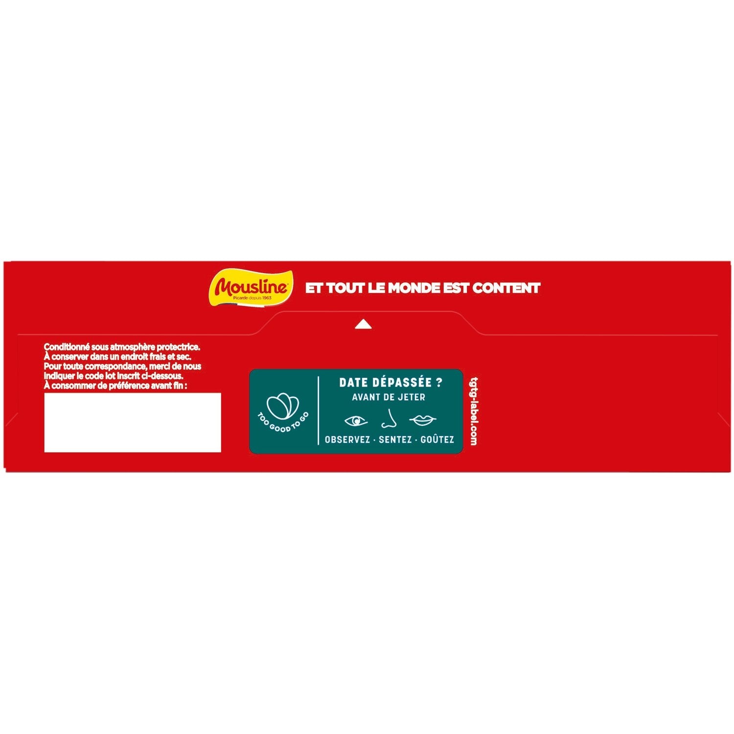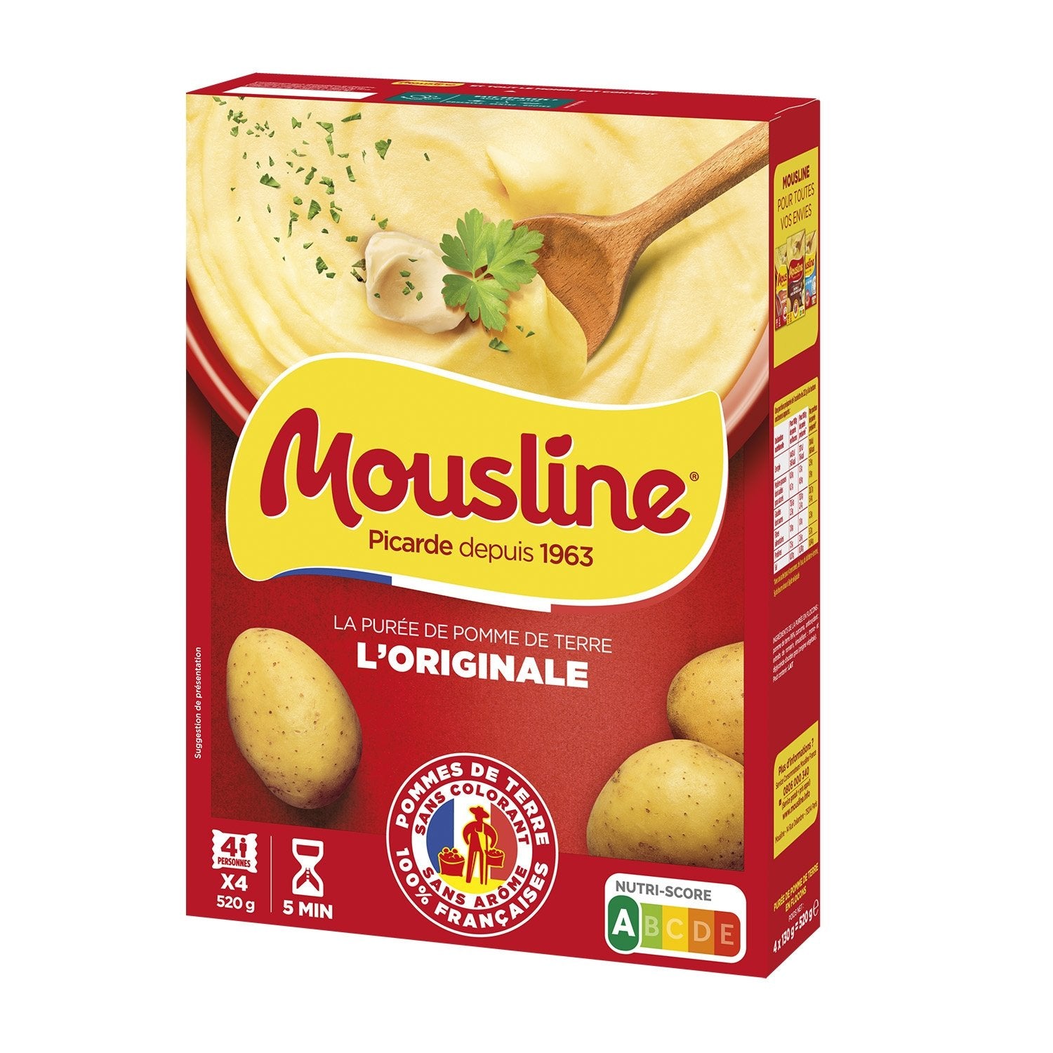 Discover our delicious MOUSLINE L'ORIGINALE mashed potatoes, made from 99% potatoes, a touch of turmeric for color, rosemary extracts for preservation, and a plant-based emulsifier for dehydration. Our L'ORIGINALE mashed potatoes are free from coloring and flavoring. Our potatoes are 100% French and mostly harvested within 30 km of our factory in Hauts-de-France. MOUSLINE is committed to offering you the best mashed potatoes: carefully selected potatoes, steamed, simply passed through a giant potato ricer before being dried into flakes, then cooked with our other delicious ingredients. Recyclable cardboard. One box contains 4 sachets for 4 people. MOUSLINE, and everyone is happy!