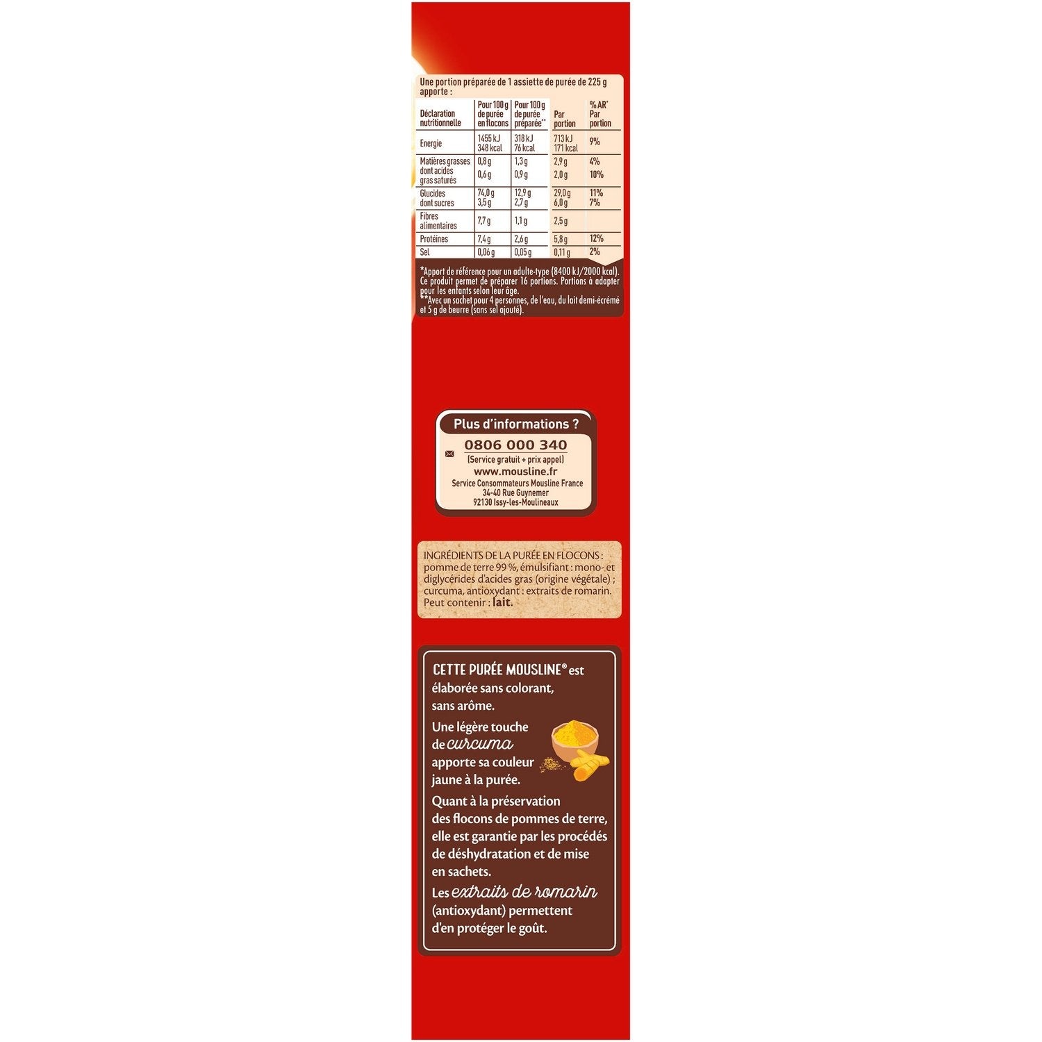 A delicious mash made from 99% potatoes, produced in our factory in Hauts-de-France.,No coloring, no flavoring and naturally gluten-free.,Quick and easy to prepare: ready in 5 minutes, in a saucepan or microwave.,To each his own MOUSLINE: choose the quantities of water and milk indicated for a soft, creamy or firm mash.,Recipe idea and gourmet tip on the back of the pack.