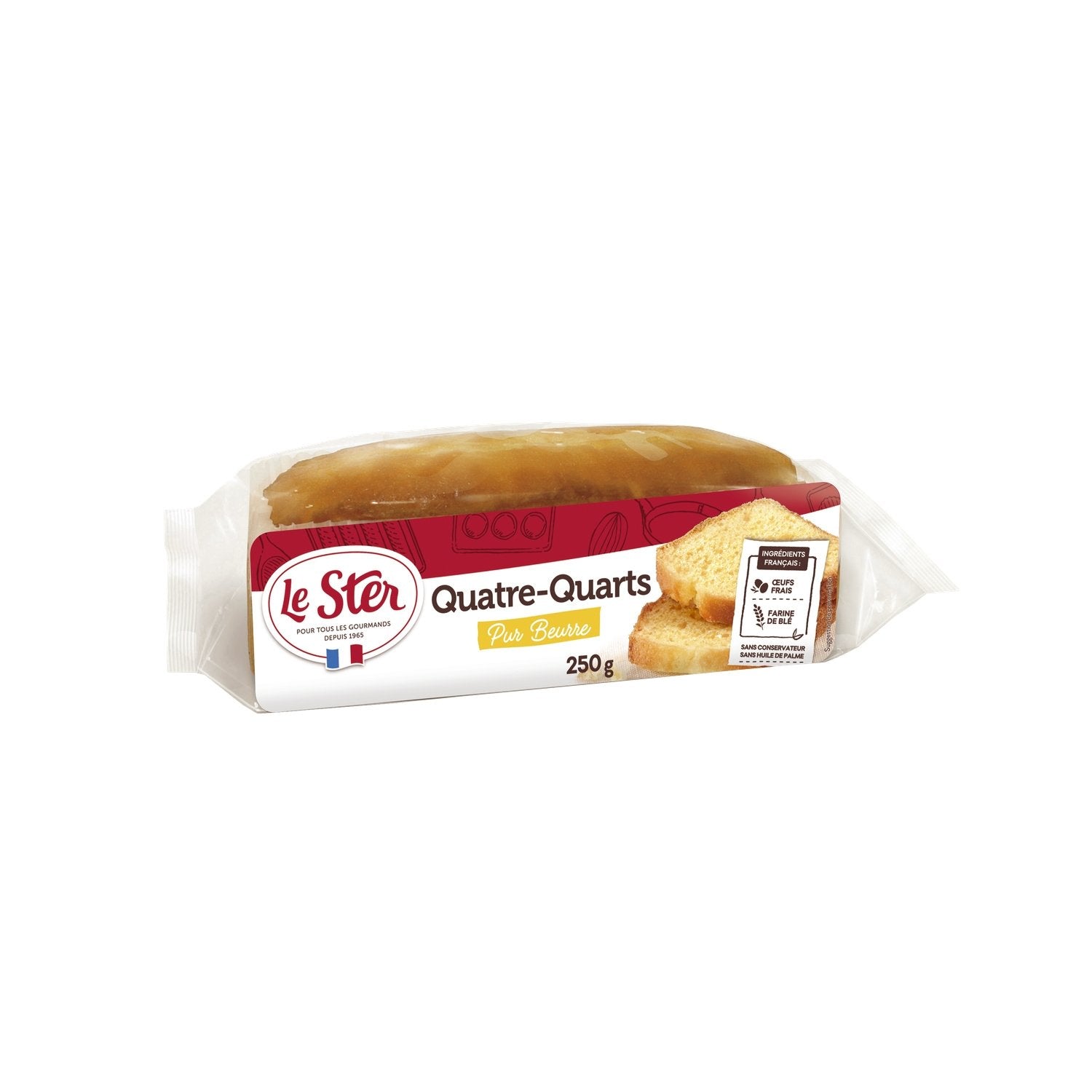 ENJOY LE STER LE PÂTISSIER'S ALL-BUTTER POUND PASTRY! ITS SECRET? IT'S MADE WITH FRESH EGGS, FRENCH AND RESPONSIBLE WHEAT FLOUR, PASTRY BUTTER, AND IS GUARANTEED PALM OIL-FREE AND PRESERVATIVE-FREE. AN IDEAL CAKE THAT WILL DELIGHT LOVERS OF GOURMET FOOD WITH EVERYTHING. PRODUCT MADE IN FRANCE.