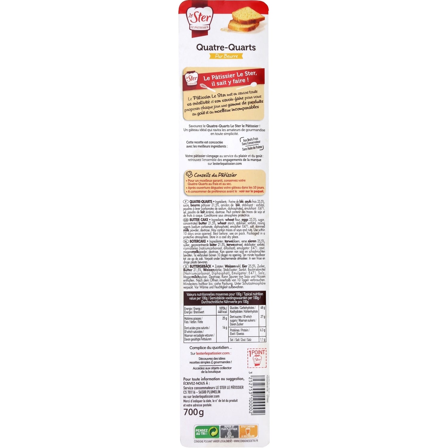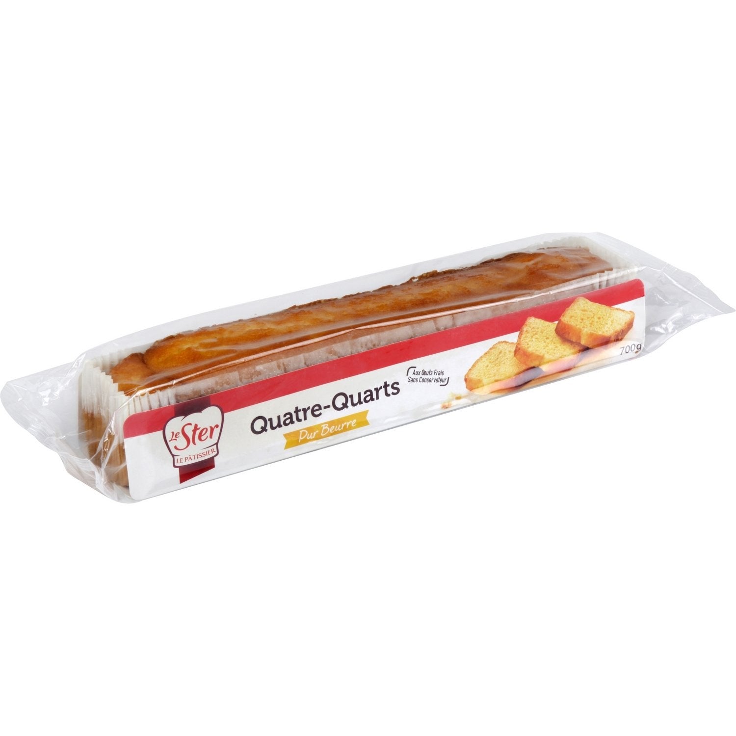 ENJOY LE STER LE PÂTISSIER'S ALL-BUTTER POUND PASTRY! ITS SECRET? IT'S MADE WITH FRESH EGGS, FRENCH AND RESPONSIBLE WHEAT FLOUR, PASTRY BUTTER, AND IS GUARANTEED PALM OIL-FREE AND PRESERVATIVE-FREE. AN IDEAL CAKE THAT WILL DELIGHT LOVERS OF GOURMET FOOD WITH EVERYTHING. PRODUCT MADE IN FRANCE.