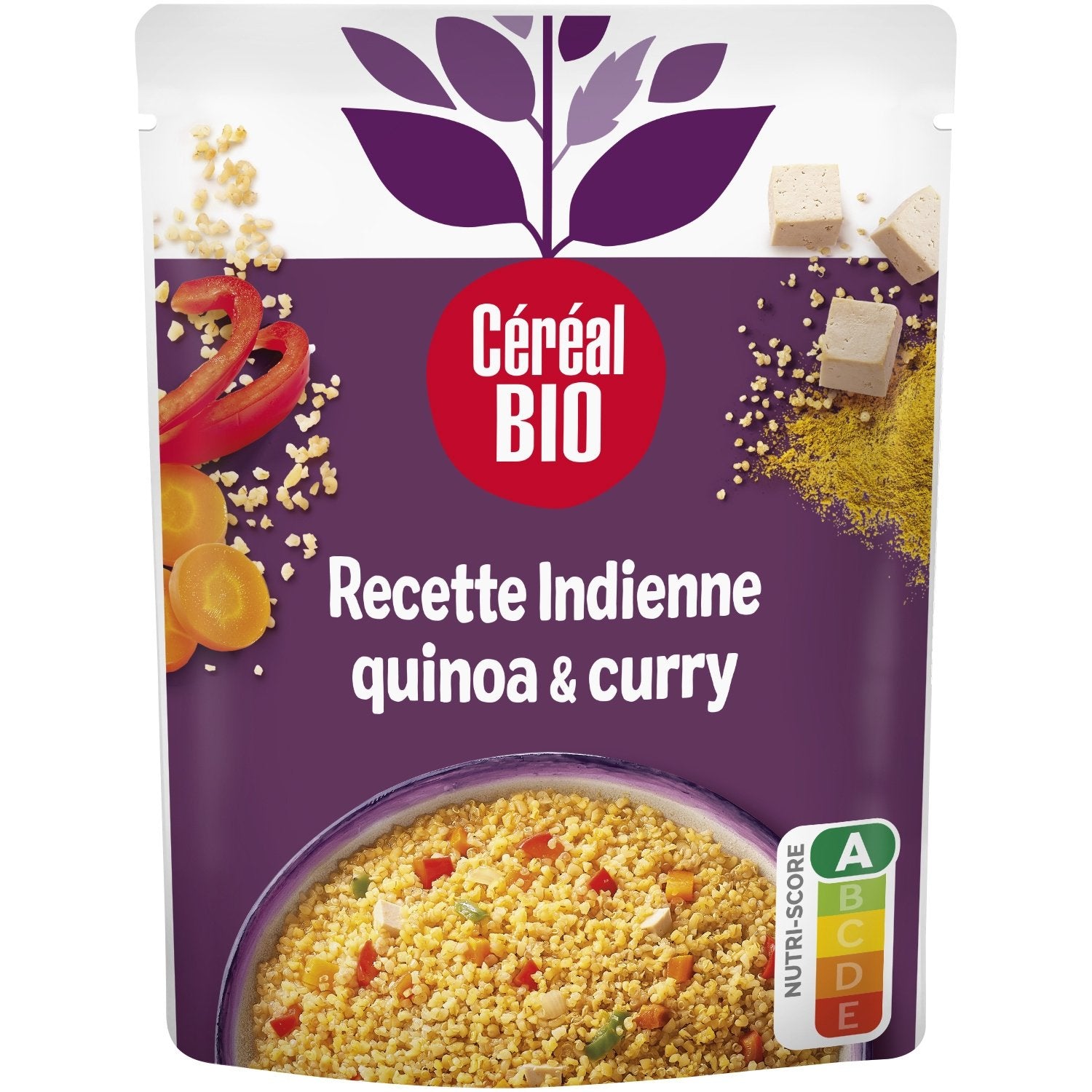 Water, quinoa* 15.4%, tofu* 14.4% (water, SOYA*, coagulating agents: calcium sulfate, nigari), durum WHEAT bulgur* 10.8%, carrots* 9.1%, peppers* 9.1%, onions* 9.1%, sunflower oil*, curry powder* (including CELERY*, MUSTARD*), sea salt, cane sugar*. * Ingredients from organic farming Made in a factory that uses NUTS, EGG, MILK, SESAME