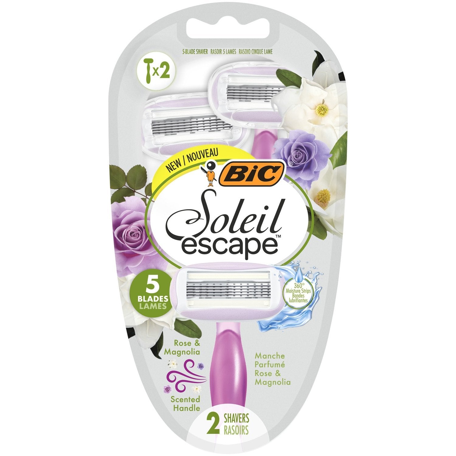BIC Soleil Escape 5 Blade Rose & Magnolia Women's Razors 2-Pack, 5 durable moving blades for a comfortable, close shave,The curved handle provides a comfortable grip and is scented with rose and magnolia for a pleasant shaving experience,Enjoy optimal glide and a smooth shave thanks to a 360° lubricating head enriched with sweet almond oil,The pivoting head of these non-rechargeable razors gently follows all the curves of your body, to remove all hairs,The rubber grip offers optimal control for a confident shave