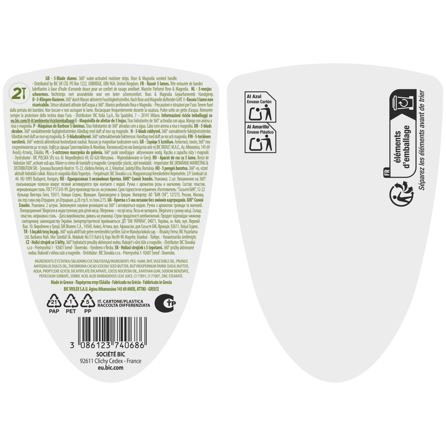 A pack of 2 BIC Soleil Escape 5 Blade Rose & Magnolia non-rechargeable women's razors that offer a close and comfortable shave with their scented handle. Featuring 5 durable moving blades, they are designed with a rubber grip for optimal control and a pivoting head that follows every curve of your body. The water-activated 360° lubricating strips are enriched with sweet almond oil to offer women a better glide on your skin, for a smooth shave. Not only does the curved handle allow for a confident grip, but it is also scented with rose and magnolia, for a pleasant shaving experience. Finally, a women's razor that makes shaving a pleasant moment to take care of your body and mind.