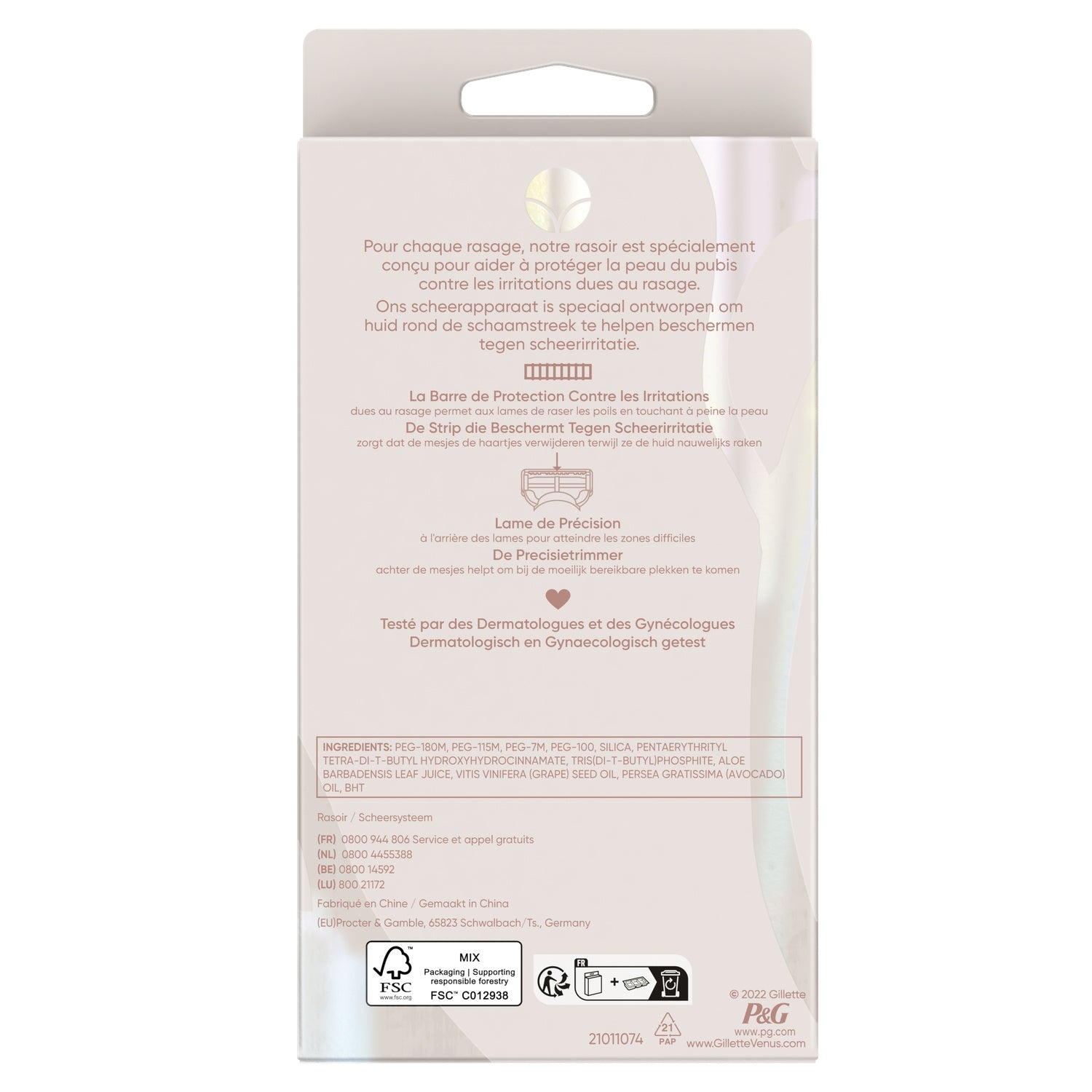 The Venus razor for skin and pubic hair is specially designed to protect this area from shaving irritation. Its irritation guard bar and optimally spaced blades allow the blades to cut hair while barely touching the skin. The razor refills are equipped with a precision edge on the back of the blades for hard-to-reach areas. With a touch of aloe vera, the razor is designed for the most sensitive areas of the body.