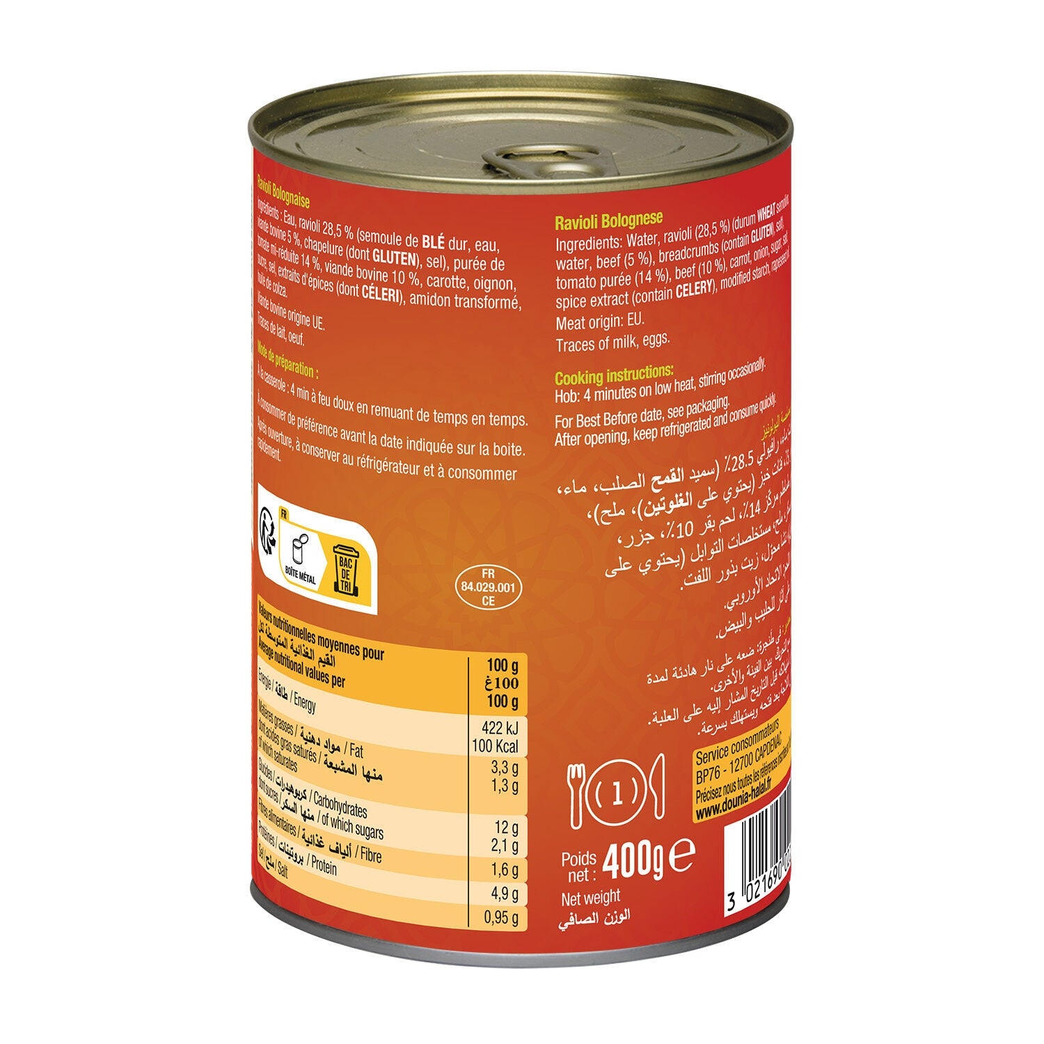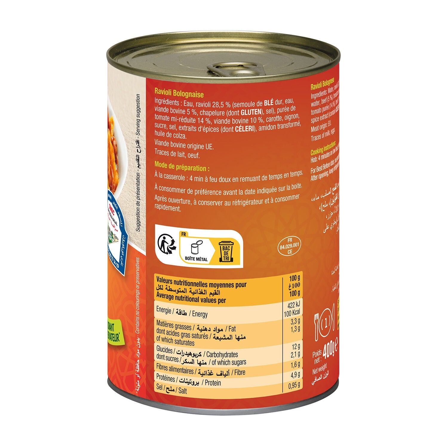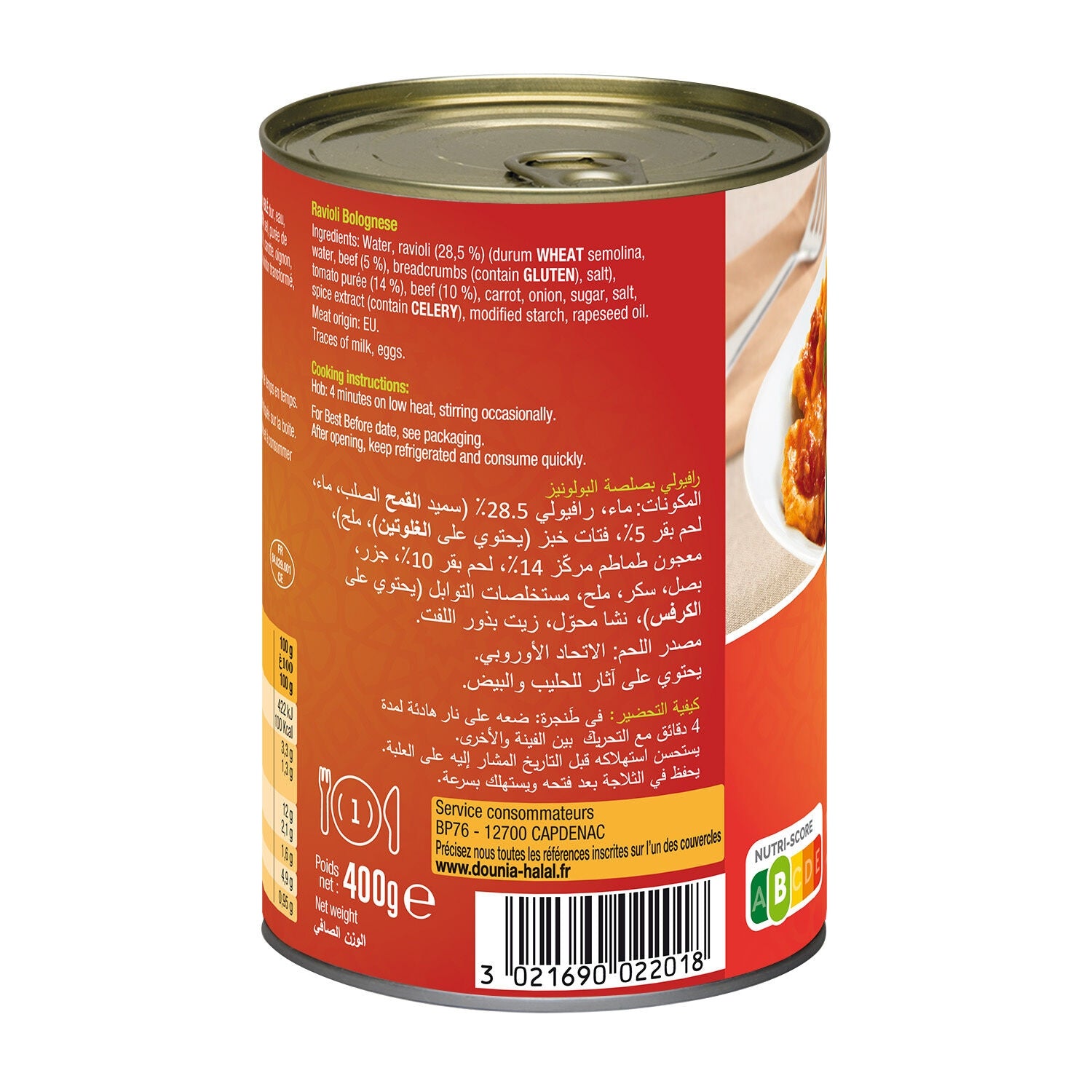 Water, ravioli 28.5% (durum WHEAT semolina, water, beef 5%, breadcrumbs (including GLUTEN), salt), semi-reduced tomato puree 14%, beef 10%, carrot, onion, sugar, salt, spice extracts (including CELERY), processed starch, rapeseed oil. Beef from EU. Traces of MILK, EGG.
