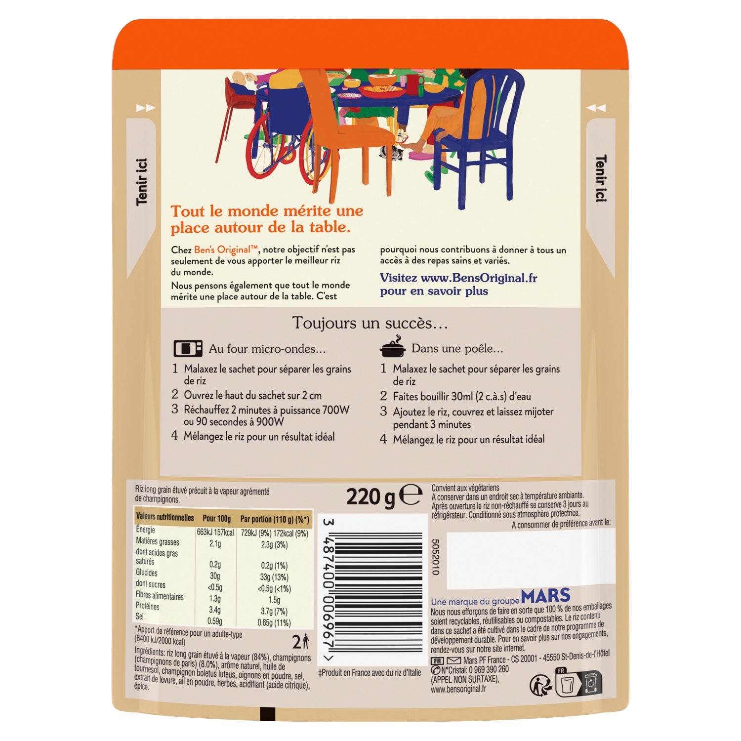 Ben's Original® Cooked Rice with Button Mushrooms is a long-grain rice that's slowly pre-steamed and cooked with real button mushrooms and yellow boletes. Convenient and quick to prepare, the rice is ready in 2 minutes in the microwave or 3 minutes in a pan. It's made in France. With this cooked rice, free of artificial colors, flavors, and preservatives, you can create delicious and healthy meals. Our express rice is available in a wide variety of flavors and will diversify your meals day after day. Nutriscore B Yuka score: 78/100