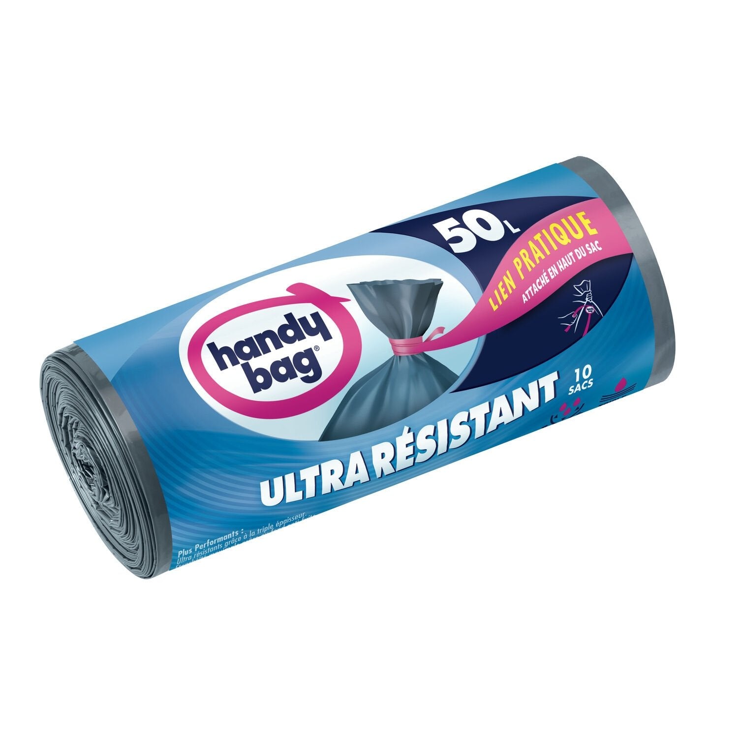 DetailsHANDY BAG ULTRA RESISTANT garbage bags PRACTICAL TIE 50 L Unit weight: 250 grs EAN barcode: 3557880353025 Brand: HANDY BAG