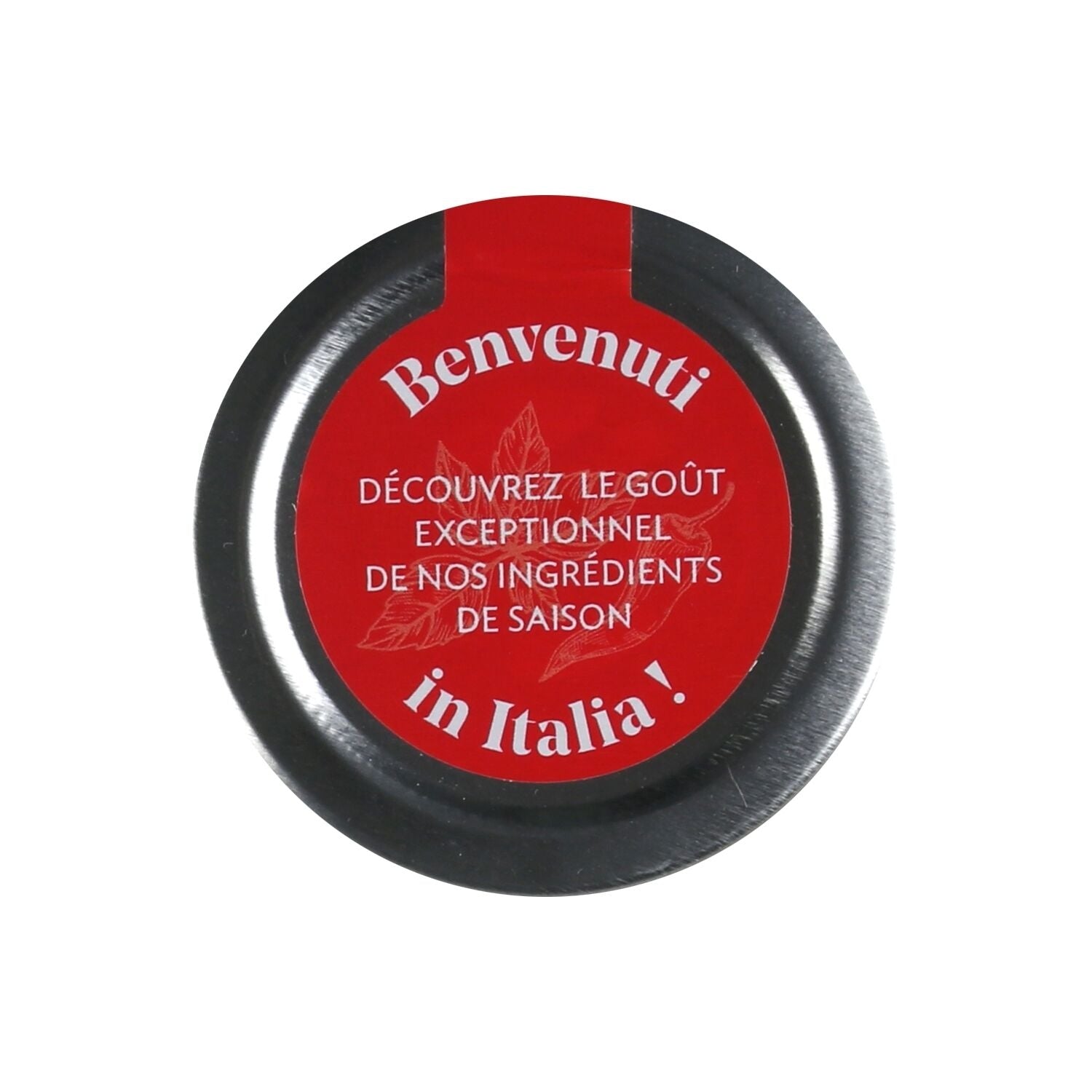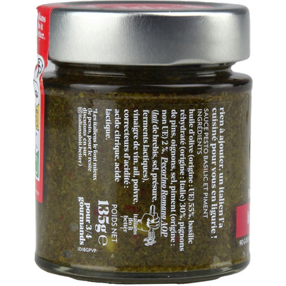 Olive oil (EU origin) 55%, rehydrated basil (Italy origin) 30%, pine nuts, onions, salt, chili pepper (non-EU origin) 2%, PECORINO ROMANO PDO (sheep's milk, salt, rennet, lactic ferments), wine vinegar, garlic, pepper, acidity regulators: citric acid, lactic acid.