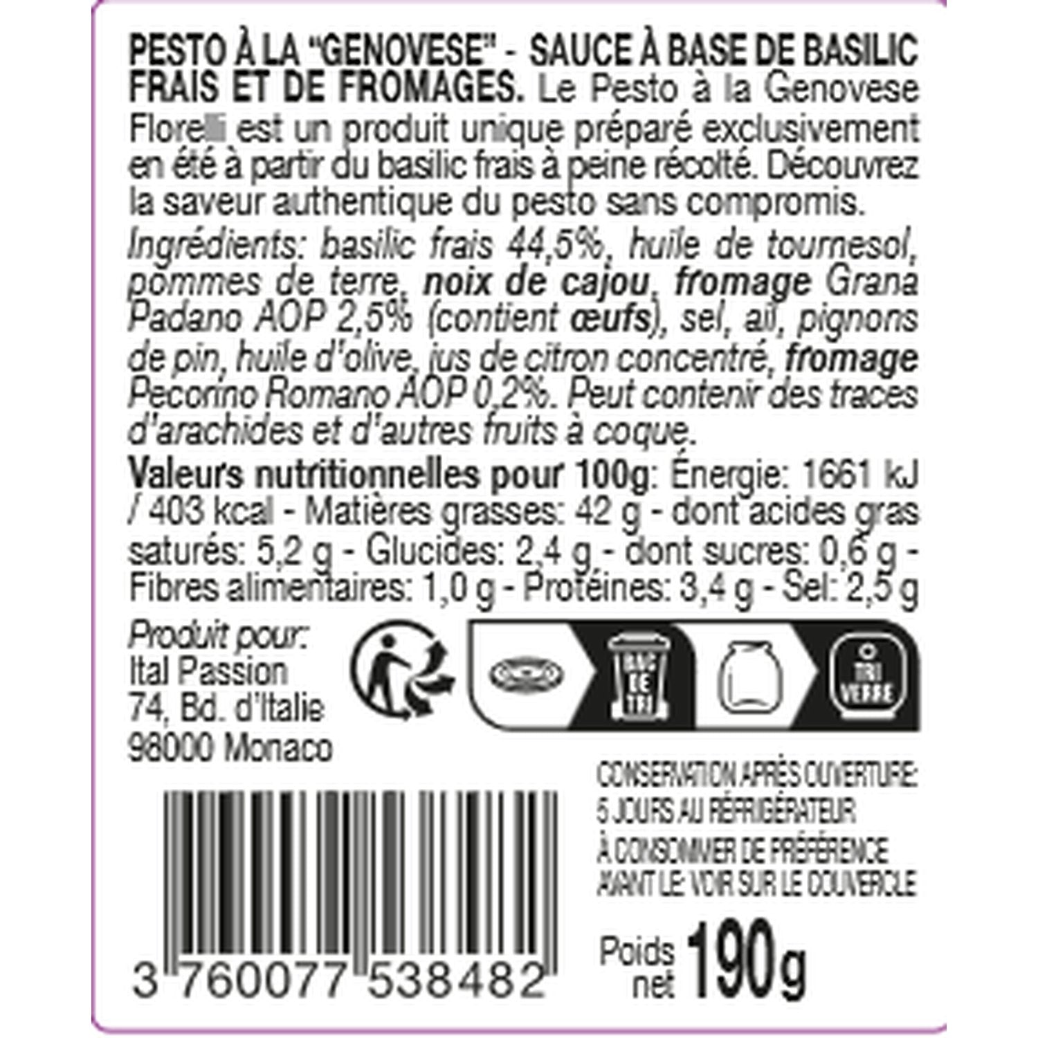 Ingredients: Italian basil 44.5%, sunflower oil, potatoes, cashew nuts, Grana Padano PDO cheese 2% (MILK, salt, rennet, contains EGG lysozyme), salt, garlic, pine nuts 0.5%, olive oil, concentrated lemon juice, Pecorino Romano PDO cheese 0.2% (sheep's milk, salt, rennet). May contain traces of PEANUTS.