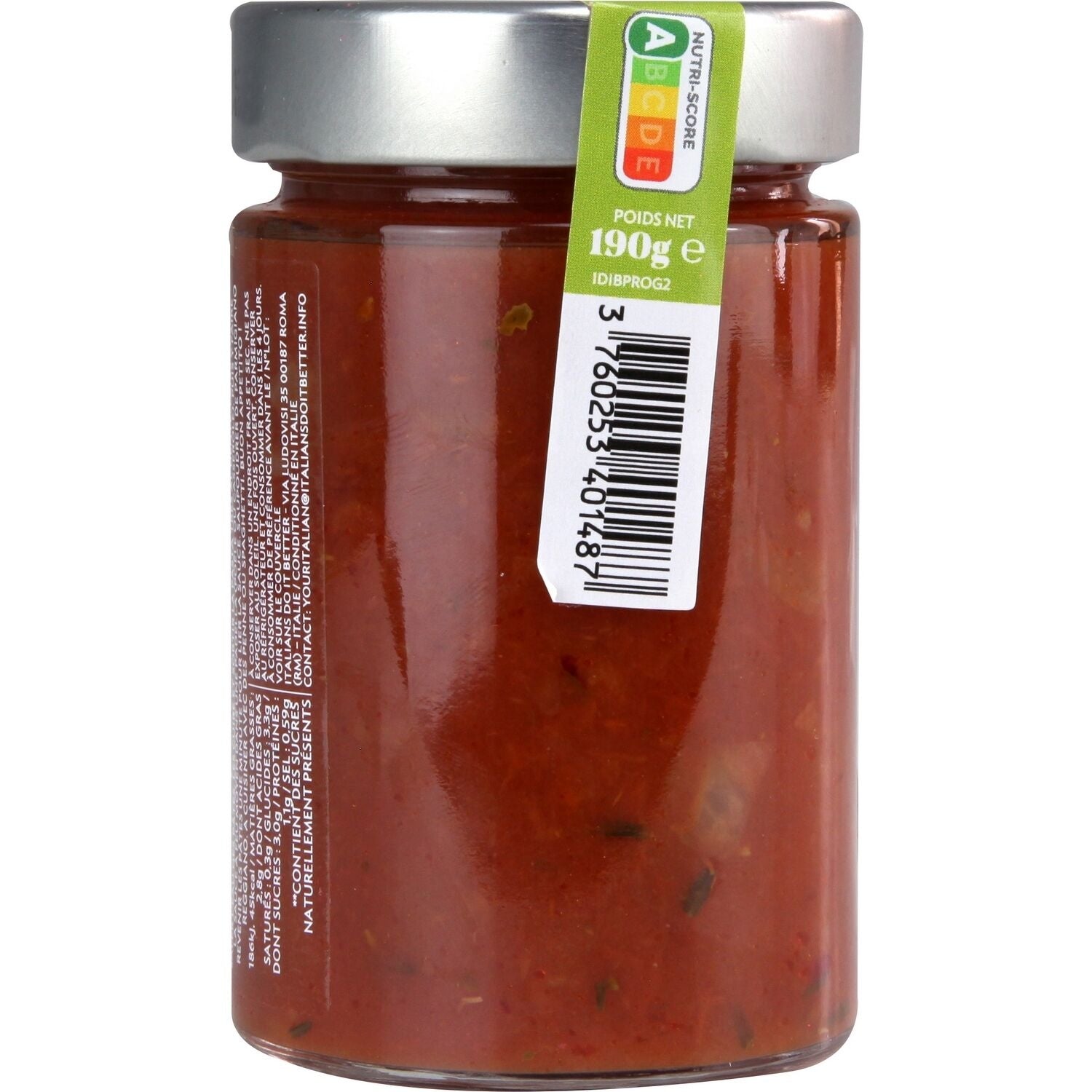 Fresh tomato pulp (origin: Italy) 91%, carrots, extra virgin olive oil, onions, salt, garlic, white pepper, oregano (0.05%), thyme (0.05%).