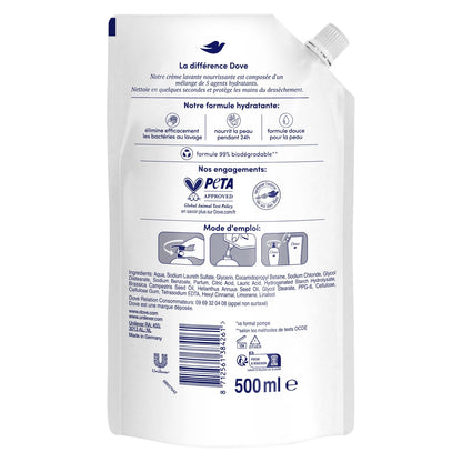 Dove Intense Nutrition Hand Wash in a 500ml refill pack cleanses, moisturizes, and protects your hands from dryness every day.,Containing a blend of five moisturizing agents, this liquid hand soap effectively eliminates bacteria when washing and protects the skin from drying out.,This Dove hand wash cares for your hands, leaving them soft and delicately scented.,This 500ml refill pack of hand soap allows you to refill your Dove Intense Nutrition pump bottle twice and contains 80% less plastic compared to two Dove 250ml pump bottles.,Discover Dove Intense Nutrition Hand Wash in a generous and convenient pack.,The cleansing agents in this hand soap effectively remove surface dirt and leave you with a rich, creamy lather.