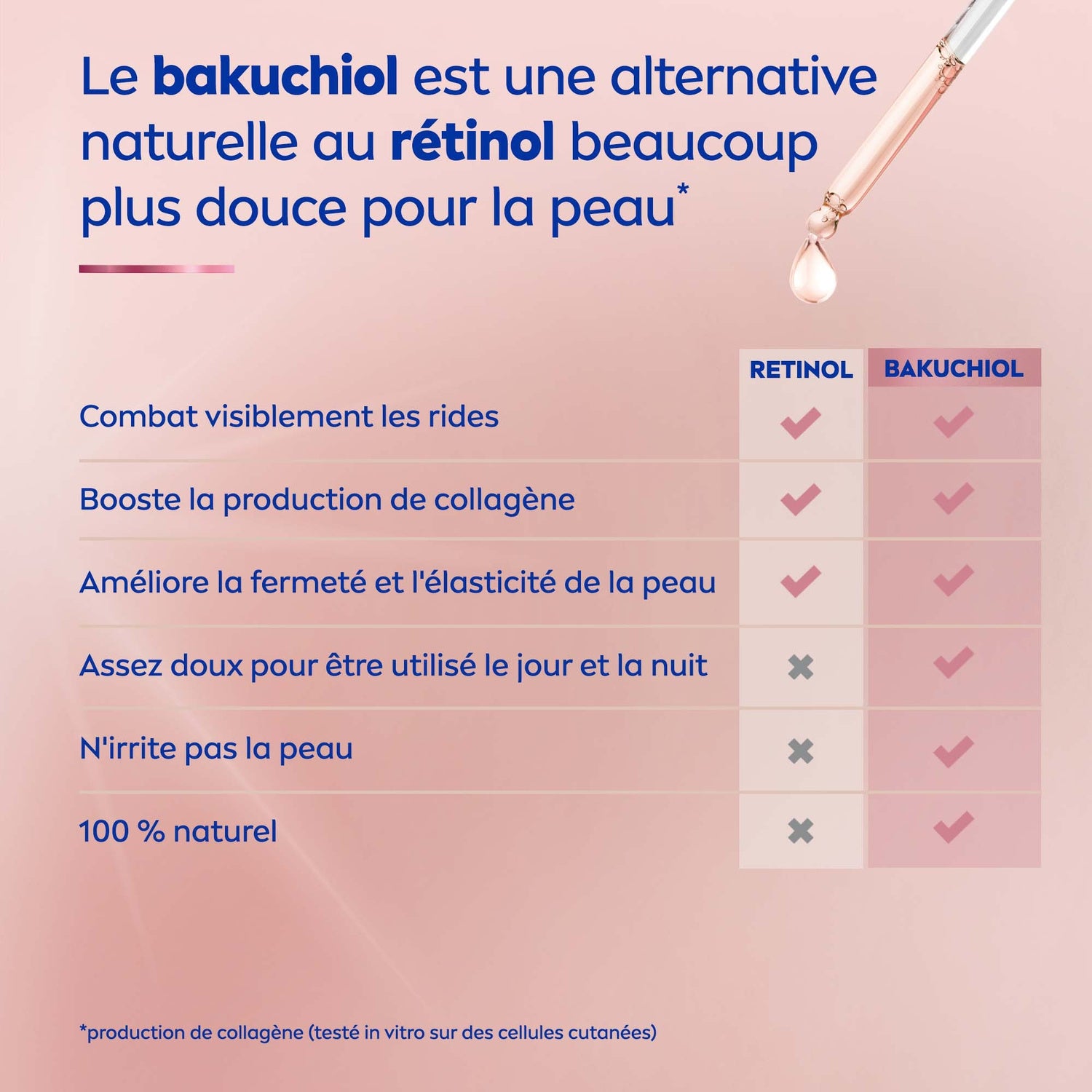 The light-textured serum acts at the cellular level for a lifting effect. Women confirm: it is THE Anti-Aging Serum for a real lifting effect on the skin3 The formula contains an innovative ingredient: 10 X PURE BAKUCHIOL, OUR HIGHEST CONCENTRATION (compared to the Bakuchiol used in NIVEA CELLULAR EXPERT LIFT day and night care). Bakuchiol stimulates cell renewal and boosts 2 types of collagen in 4 hours (in vitro) PROVEN RESULTS: IMMEDIATELY: Skin appears lifted with fewer visible wrinkles 1 WEEK: Skin is firmed, its elasticity is improved Gentle on the skin and effective for all skin types, even sensitive. 3Consumer test, 2 weeks, 157 women