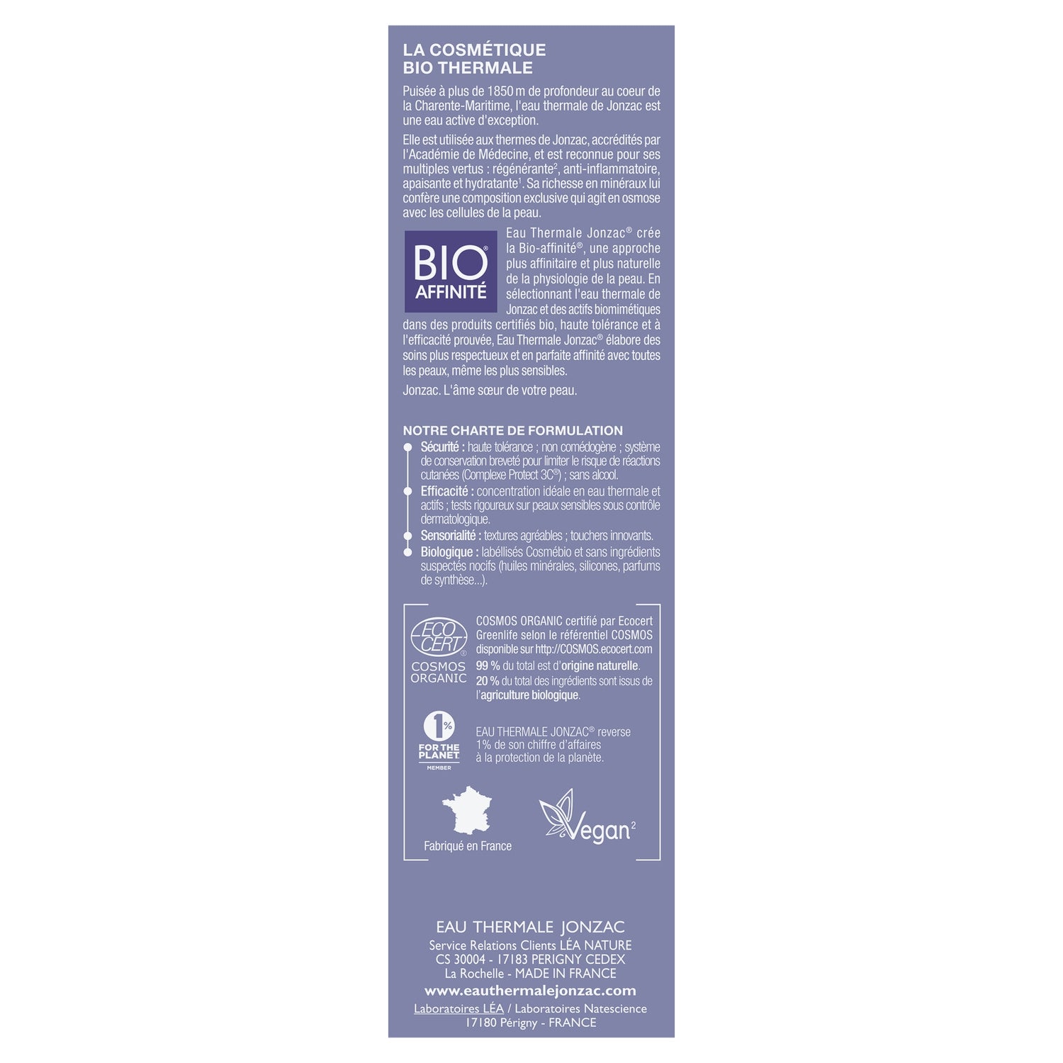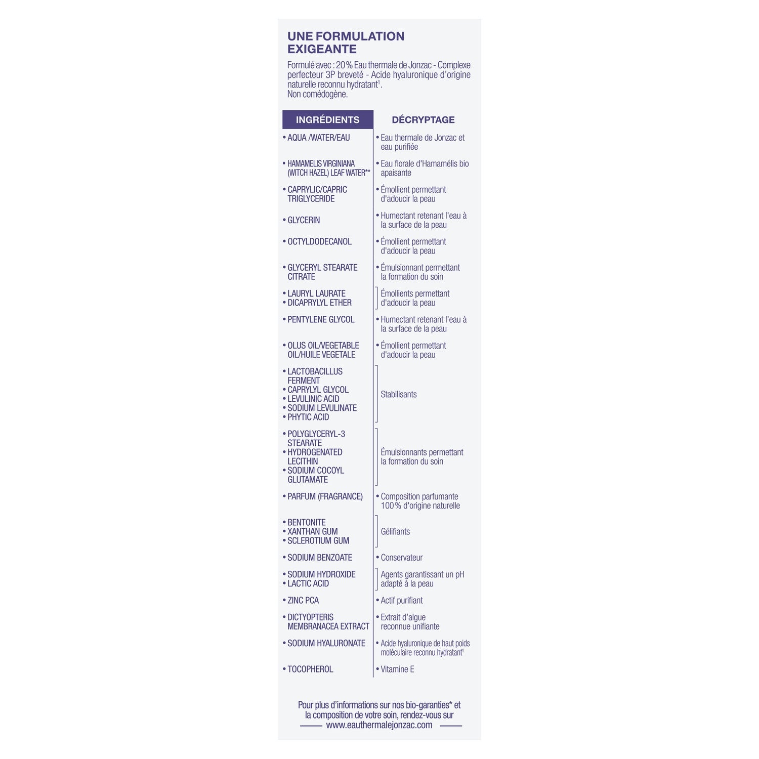 Aqua /Water / Eau **, Anthemis Nobilis Flower Water*, Dicaprylyl Carbonate, Hamamelis Virginiana (Witch Hazel) Water*, Coco-Caprylate/Caprate, Glycerin, Caprylic/Capric Triglyceride, Glyceryl Stearate SE, Alpha-Glucan Oligosaccharide, Glyceryl Stearate Citrate, Lactobacillus Ferment, Stearyl Alcohol, Sodium Levulinate, Parfum (Fragrance), Sodium Cocoyl Glutamate, Acid, Sodium Hydroxide*Ingredients from agriculture Organic.**Water and Jonzac thermal spring water. 99% of the total ingredients are of natural origin. 20% of the total ingredients are from organic farming.