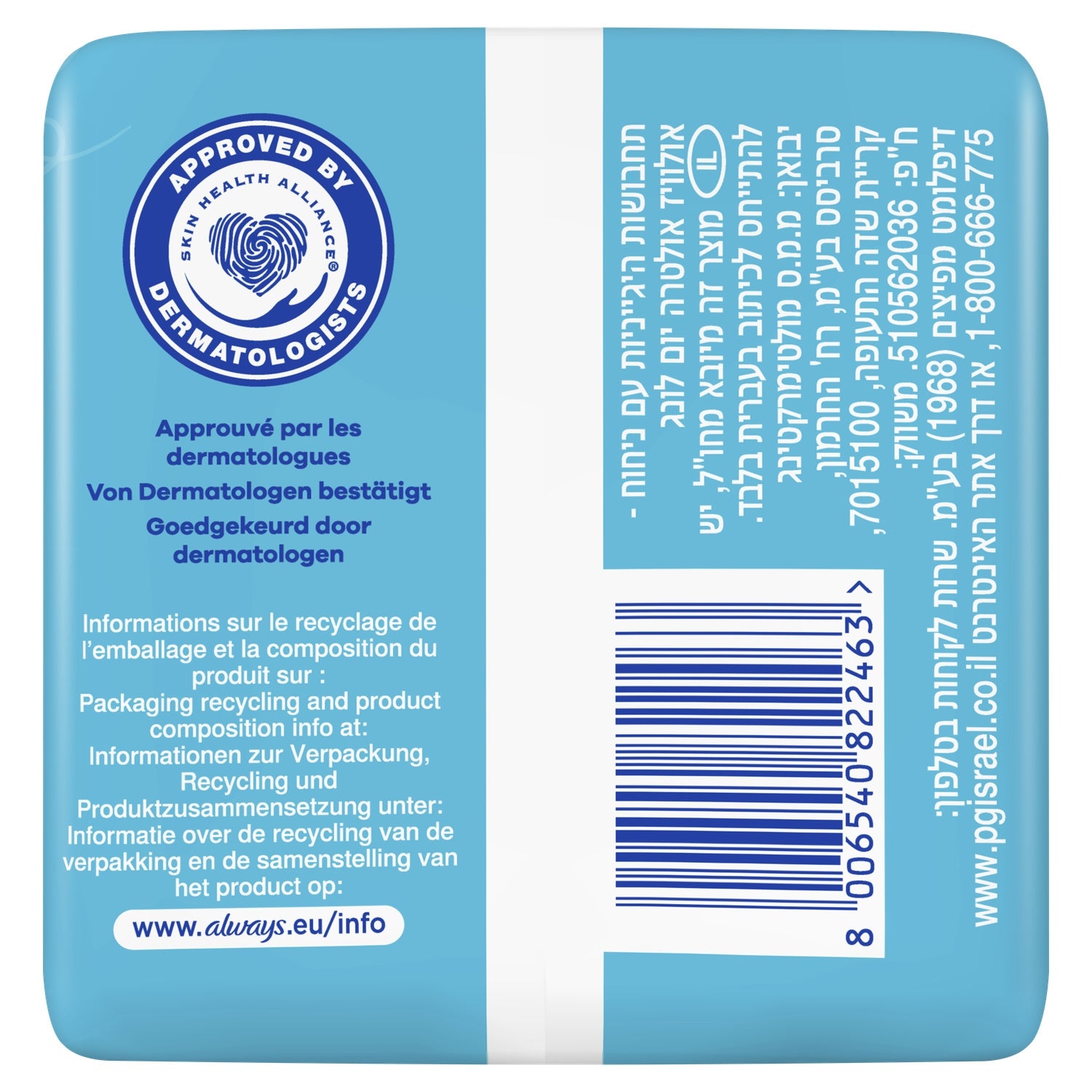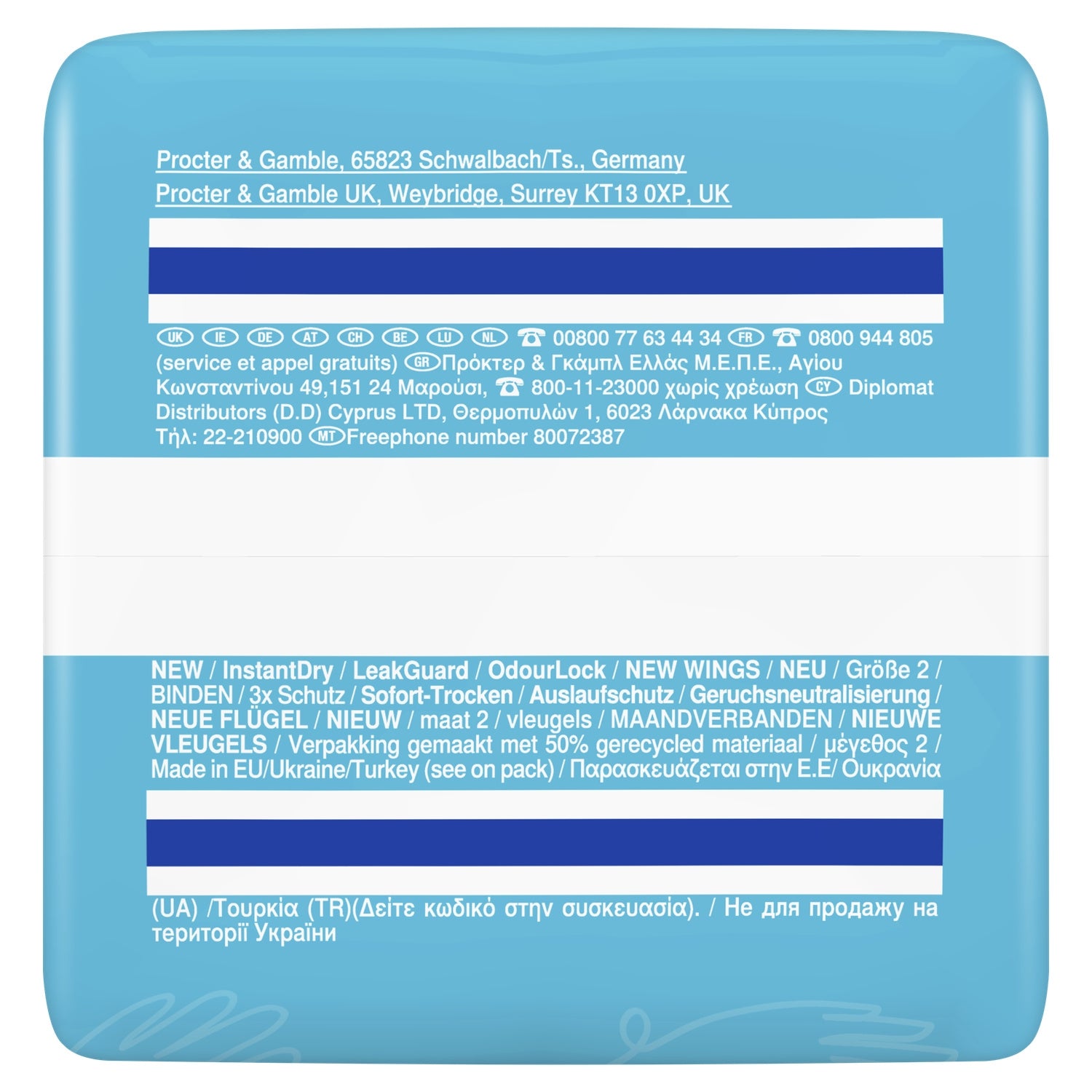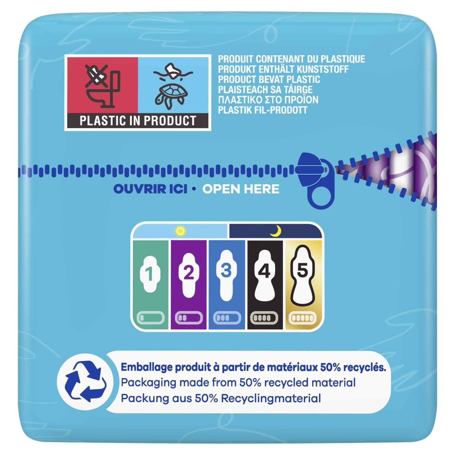 Triple protection so you feel fresh and dry during your period, Featuring InstantAbsorb, the pad absorbs liquid in seconds, Anti-Leak technology locks in liquid and helps prevent leaks, Absorbent, soft-touch top sheet, OdourBlock technology neutralizes odors, ComfortLock wings are designed to fit under any type of lingerie, Outer packaging made from 50% recycled plastic, Approved by Skin Health Alliance dermatologists