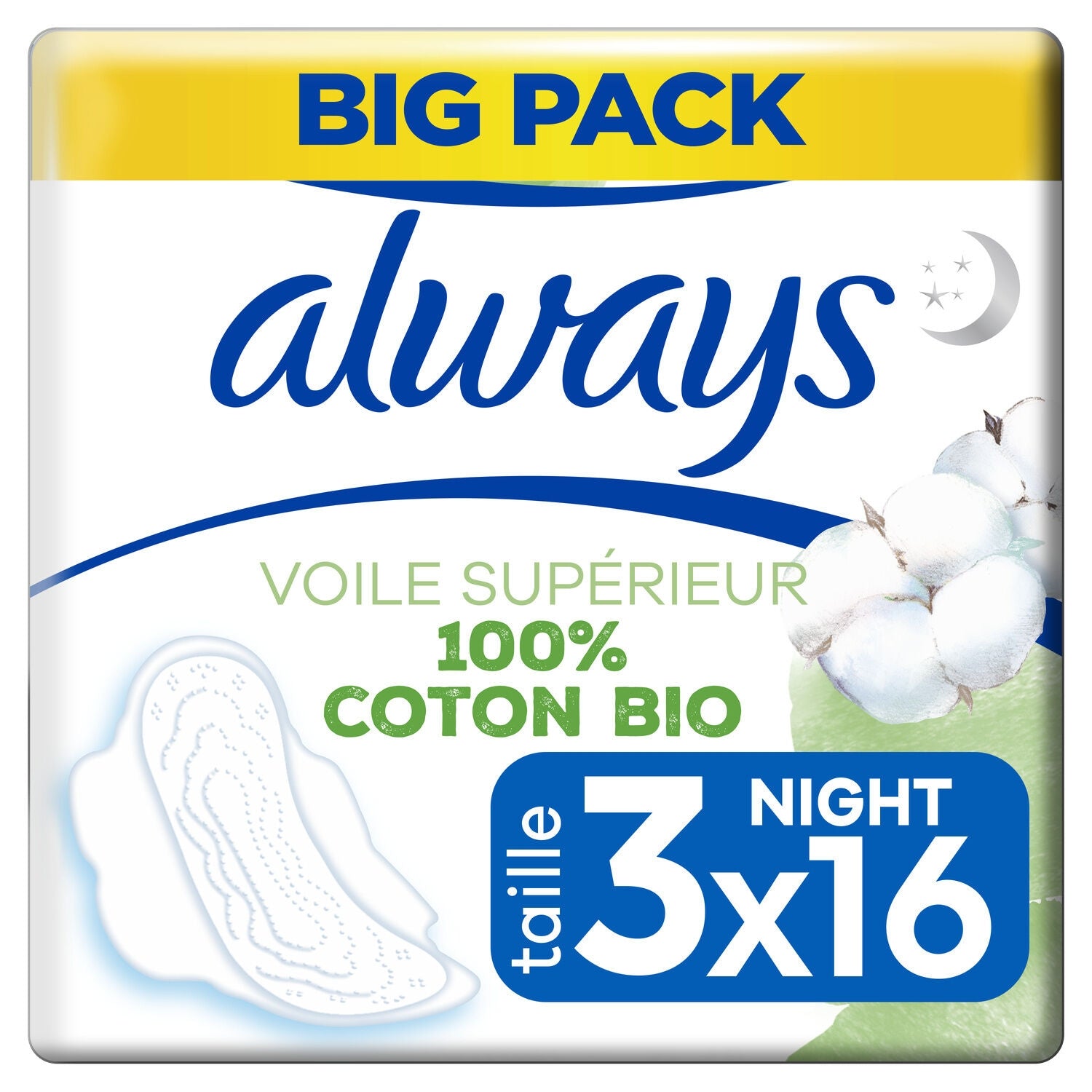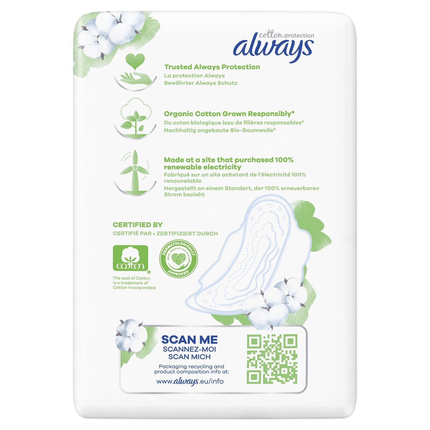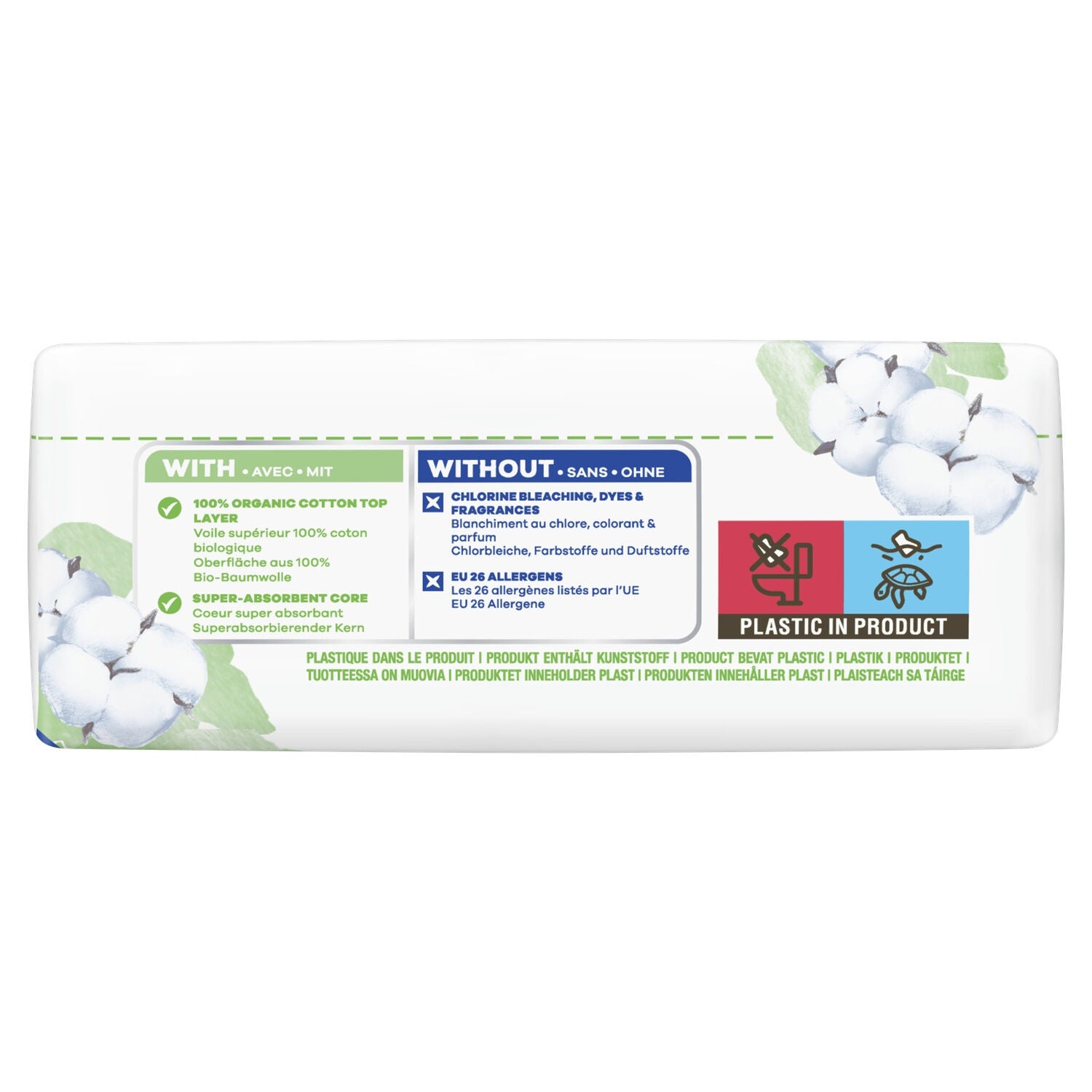 Always protection with a 100% organic cotton skin-contact layer, Fragrance-free, dye-free, and chlorine-free pads, A core with ultra-absorbent gel that turns liquid into gel and prevents leaks, With wings to keep the pad in place, A thin pad for optimal comfort, Approved by dermatologists of the Skin Health Alliance, Certified by Cotton Inc