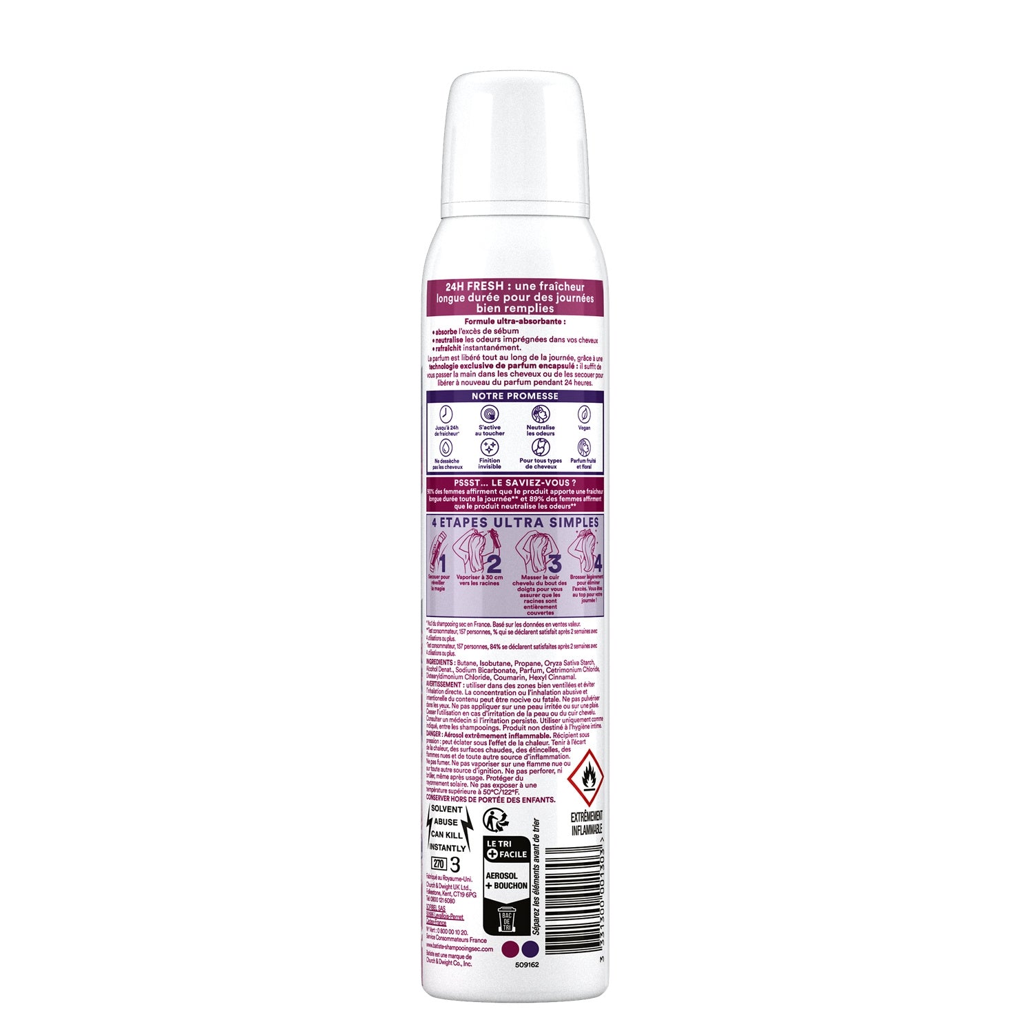 Butane, Isobutane, Propane, Oryza Sativa Starch, Alcohol Denat., Sodium Bicarbonate, Parfum, Cetrimonium Chloride, Distearyldimonium Chloride, Coumarin, Hexyl Cinnamal. Butane, Isobutane, Propane, Oryza Sativa Starch, Alcohol Denat., Sodium Bicarbonate, Parfum, Cetrimonium Chloride, Distearyldimonium Chloride, Coumarin, Hexyl Cinnamal.