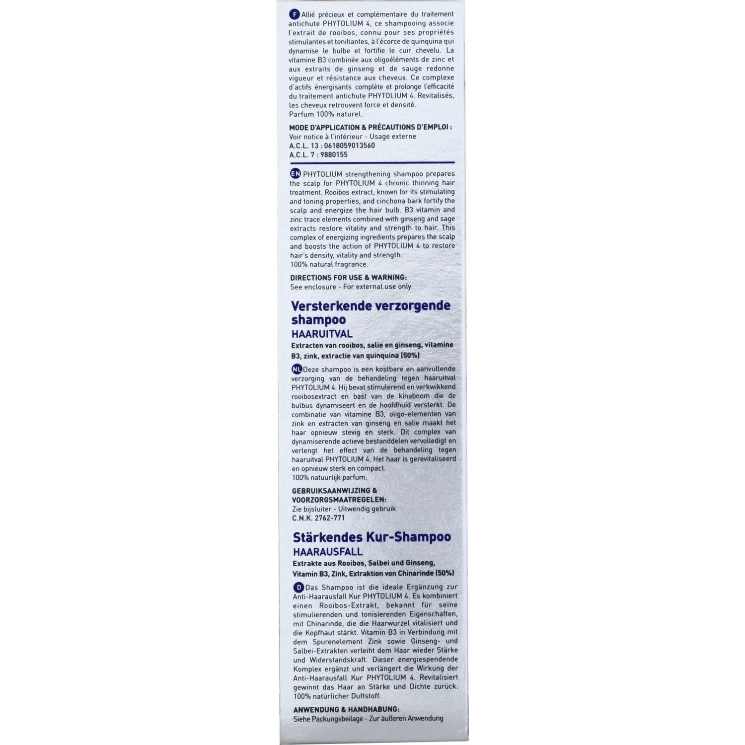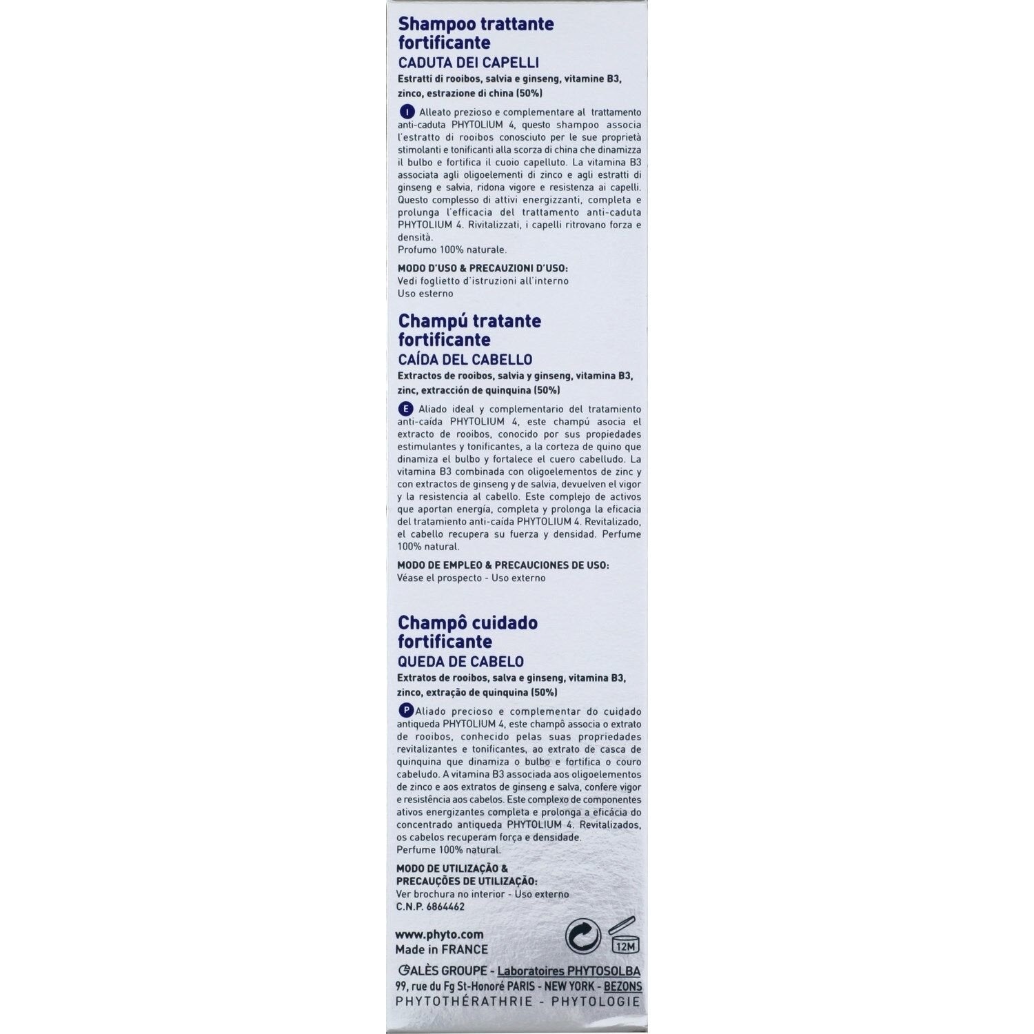 Phytolium Fortifying Treatment ShampooCinchona succirubra bark extract( cinchona extraction) *, water/ aqua( raw material constituent) *, cocamidopropyl betaine( coconut oil derivative) *, sodium lauryl glucose carboxylate*, lauryl glucoside( coconut oil and corn starch derivatives) *, disodium cocoamphodiacetate( coconut oil derivative) *, sodium chloride*, inulin( coconut extract)