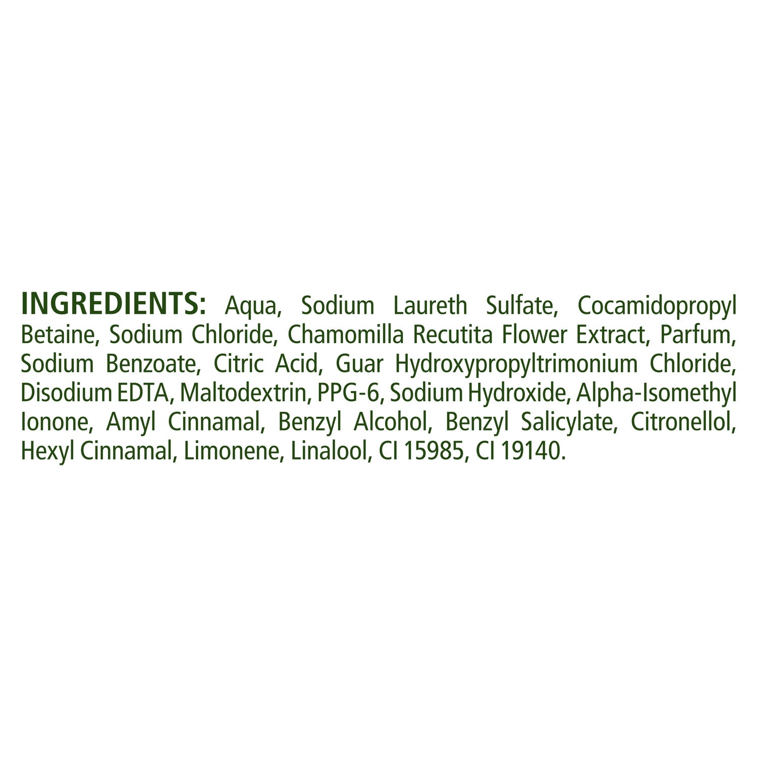 Ingredients: Aqua, Sodium Laureth Sulfate, Cocamidopropyl Betaine, Sodium Chloride, Chamomilla Recutita Flower Extract, Parfum, Sodium Benzoate, Citric Acid, Guar Hydroxypropyltrimonium Chloride, Disodium EDTA, Maltodextrin, PPG-6, Sodium Hydroxide, Alpha-Isomethyl Ionone, Amyl Cinnamal, Benzyl Alcohol, Benzyl Salicylate, Citronellol, Hexyl Cinnamal, Limonene, Linalool, CI 15985, CI 19140.