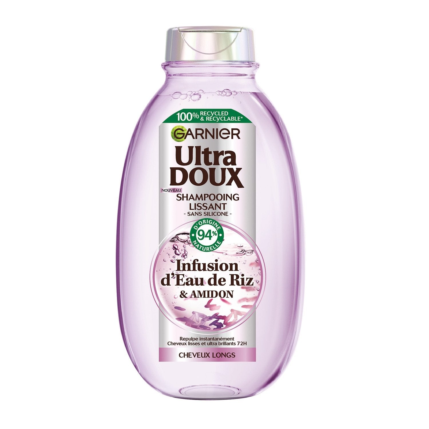 Garnier Ultra Doux Smoothing Shampoo with Rice Water & Starch Infusion for long hair. Results: Hair is smooth and ultra-shiny for up to 72 hours*. *Instrumental test after application of shampoo + mask
