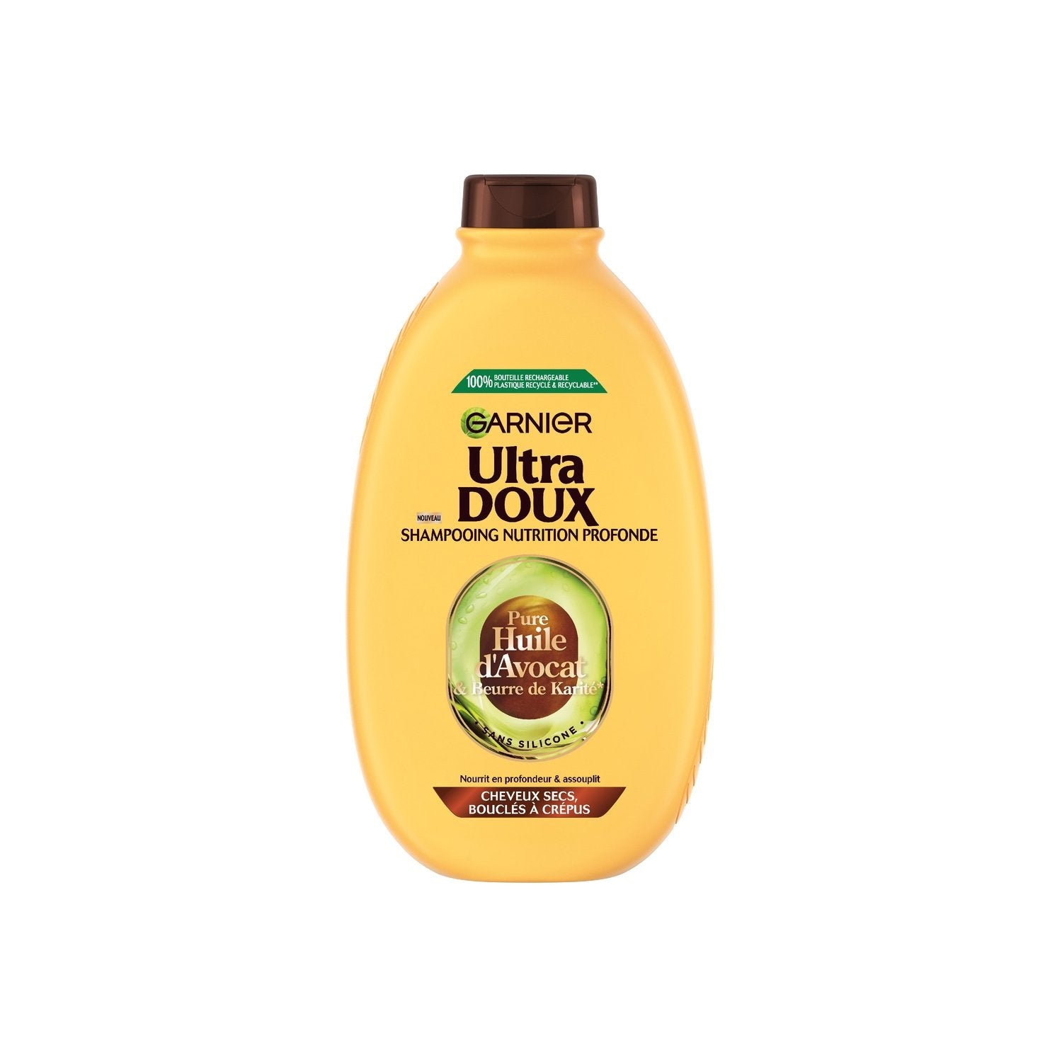 Garnier Ultra Doux Nourishing Shampoo with Avocado Oil and Shea Butter for dry, curly to frizzy hair. Result: Dry, curly to frizzy hair is clean and nourished, easier to style, for beautiful hair!