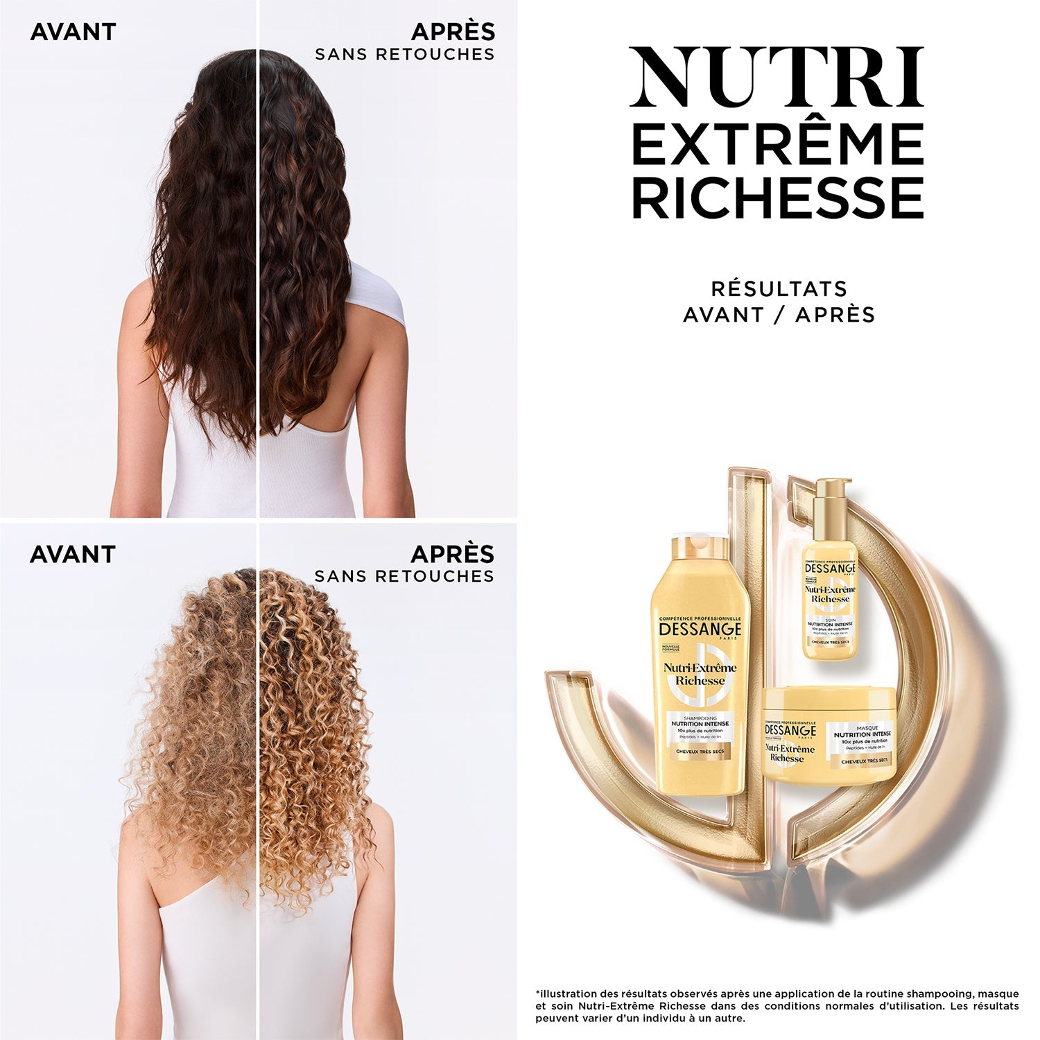 Your very dry hair is often coarse, dull, and very difficult to style. Only a great hairdresser knows the secret to nourishing it long-lasting and restoring strength, discipline, and shine. Inspired by salons, the Nutri-Extrême Richesse protocol offers a real concentrate of nutrition to your very dry and damaged hair. Its new moisturizing formula, enriched with a peptide care complex and linseed oil, generously permeates the fiber to intensely nourish it. Your hair is 10 times more nourished*, shiny, and easy to style. *Instrumental test after application of the Nutri-Extrême Richesse shampoo, mask, and treatment. Your hair is 10 times more nourished*, shiny, and easy to style. *Instrumental test after application of the Nutri-Extrême Richesse shampoo, mask, and treatment.